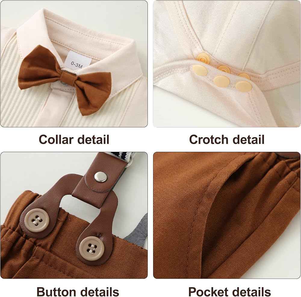 MATERIAL: The baby boy suits is made of High quality cotton blend fabric , soft, breathable and skin friendly. The top with removable bowtie and buttons at the bottom of the shirt for easy diaper changes, practical and convenient. DESIGN INSPIRATION: A dashing baby boy outfits ensemble featuring classic and innovative color combinations to add depth. The vest boasts a V-neck and faux pocket design, ensuring your little one stands out in the crowd, radiating a handsome and eye-catching charm. OCCASIONS: This suits for baby boys are perfect for both formal and casual occasions, such as weddings, baptisms, gatherings, birthdays, church events, parties, or everyday wear. It also makes a great gift for boys, making your little one look handsome and gentlemanly, becoming the center of attention wherever he goes. RECOMMENDED AGE: Suitable for 0-3 months newborn boy clothes, 3-6 months baby boy clothes, 6-12 month boy clothes, toddler baby boy clothes 12-18 months, Please refer to our size chart to find the most suitable size for your baby boys. THE PACKAGE INCLUDES: 1*dress shirt + 1*bowtie + 1*vest + 1*pair of pants +1*suspenders. Provide your baby with the most comfortable and stylish dressing experience for occasions such as Easter, Thanksgiving, Christmas, first birthday, and everyday wear.