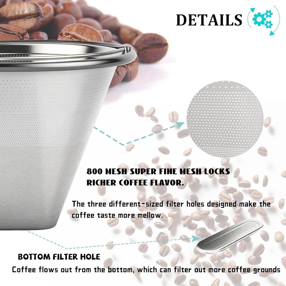 EXCELLENT DESIGN: The mesh surface of the metal coffee filter is carefully designed by the designer. The size and distance of each small hole has been tested many times to get the final result. Coffee brewed by metal coffee filters can retain the original flavor of coffee. The coffee can be brewed with a rich and full-bodied flavor.