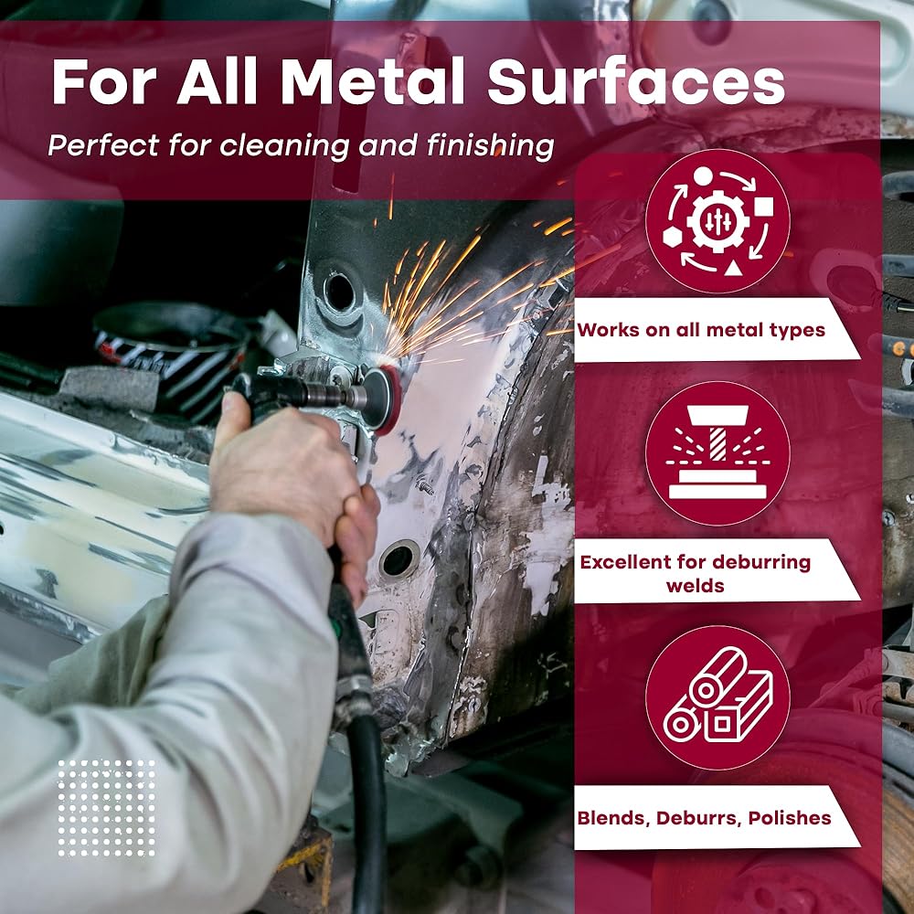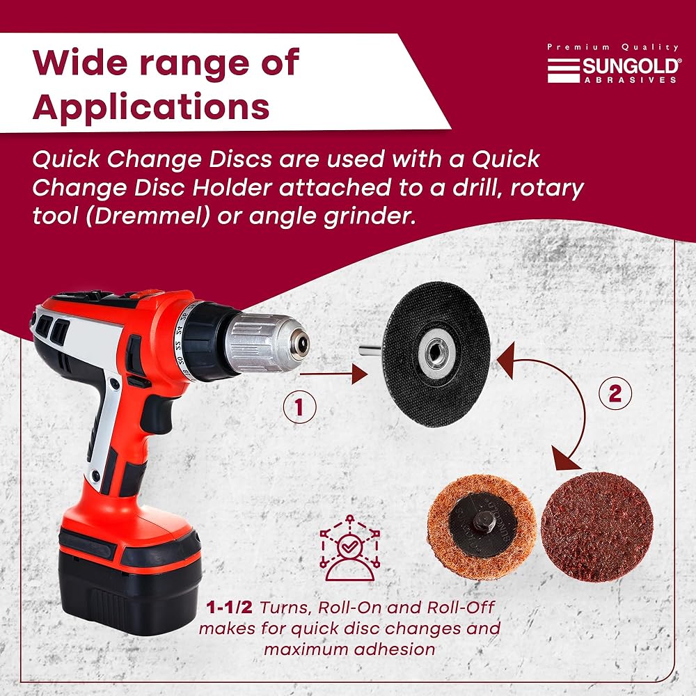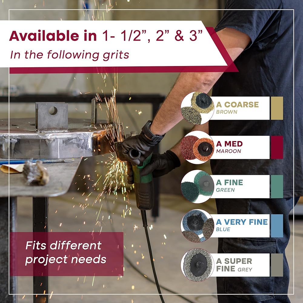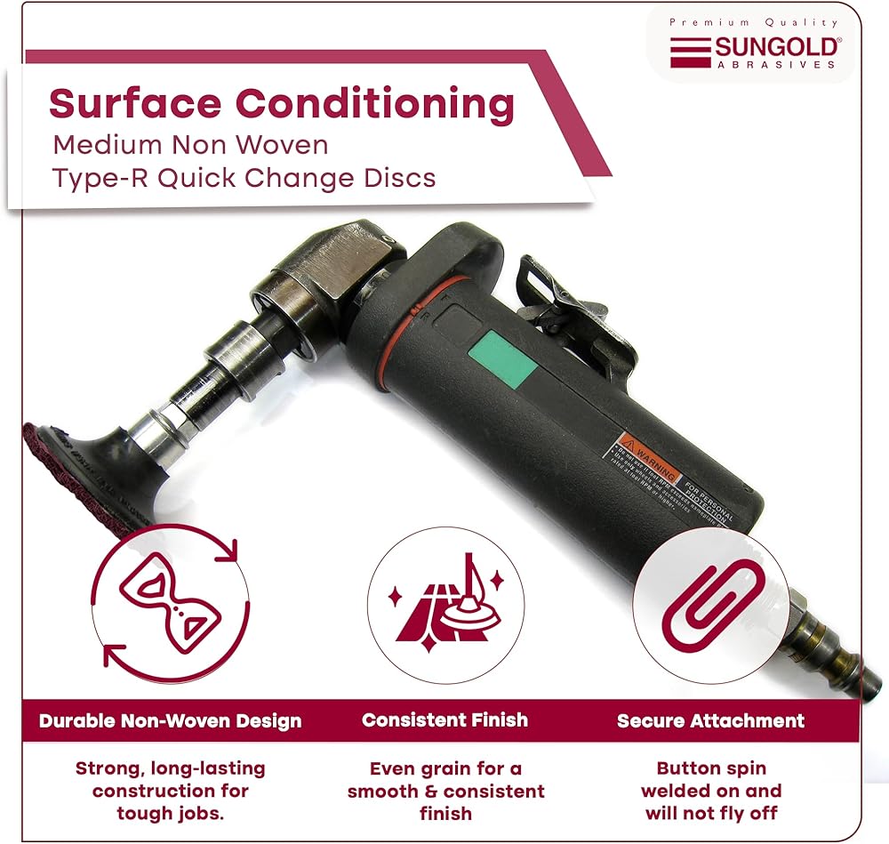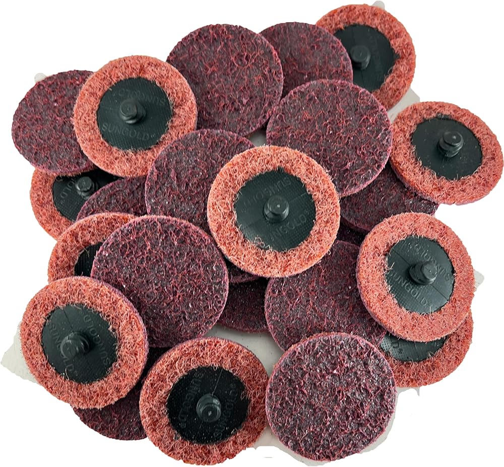 Grade: Medium Color: Maroon Grain Side - Maroon Back Side The Maroon discs are used for cleaning and finishing on all metals for removal of light rust, oxides and coatings. Combines with the quick "1/2 turn-on, 1/2 turn-off" disc fastening system Measures 2 Inch (50.8mm) diameter Maximum operating speed: 25,000 RPM Each box contains 25 discs Fits 3M Rowlock Pads 05539. For best results use with Sun gold # 99081 pad. The Sunrise family of Surface Conditioning discs are a top choice for metalworking for cleaning, finishing, blending and debarring applications.