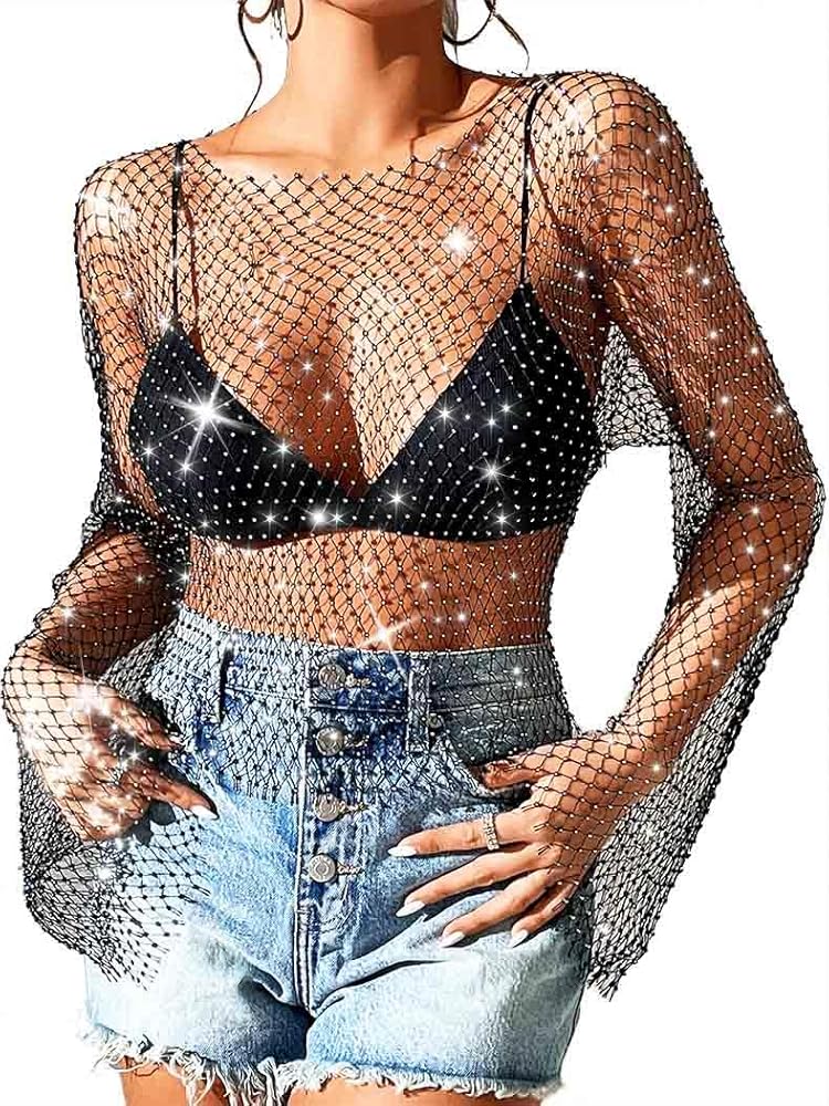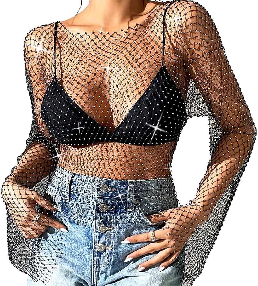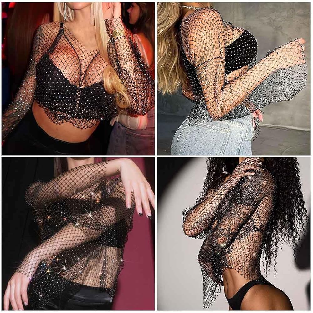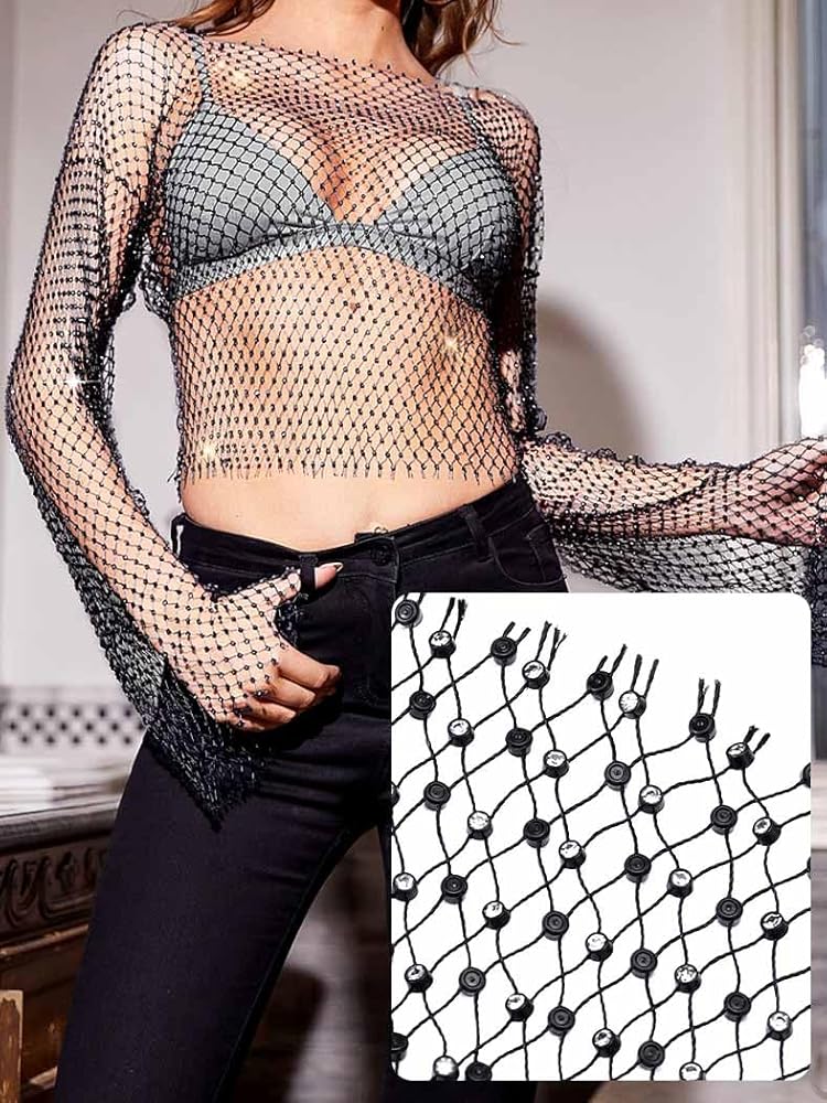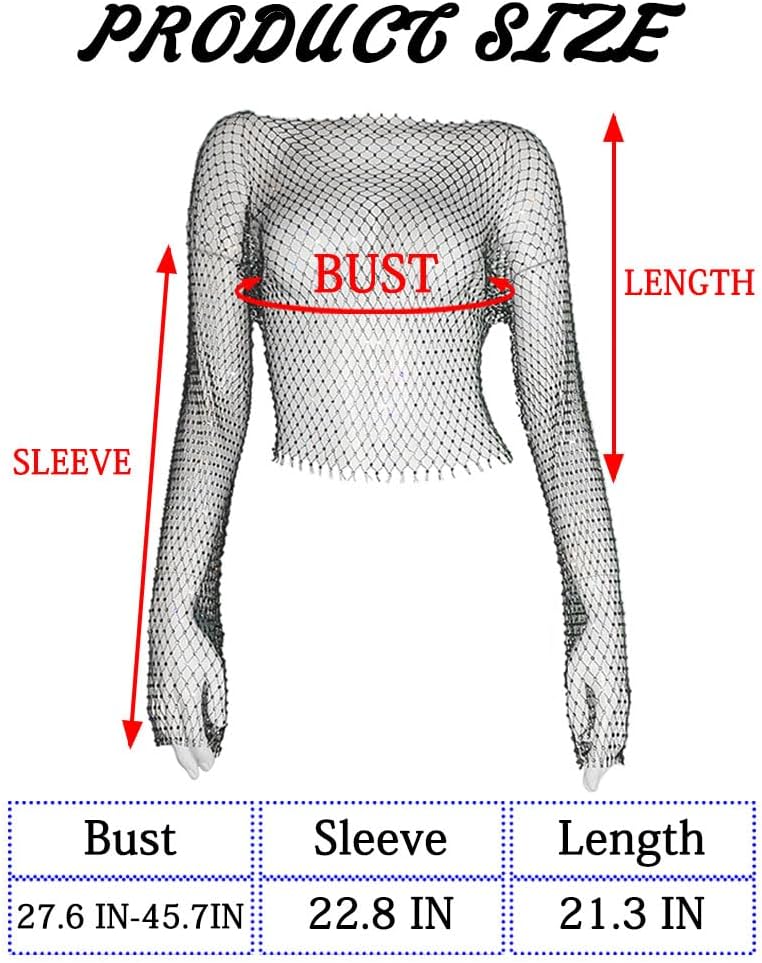 Rhinestone Fishnet Cover Up for Women Features: Materials: Polyester and Rhinestones, lightweight, skin friendly, stretchy. Sparkly See Through Shirt---Shiny rhinestone tassels on both shoulders, Wear rhinestone crop top with bikinis, halter tops, pasties, tube tops, bralette, show off your sexy body. Fashion mesh tank top an ideal choice for rave party, club, concert, carnival, festivals,vacation, travel, prom, Halloween party, celebration, birthday dress, beach, ect,. Purchase Instructions: 1. Please do not machine wash, do not rub and pull hard; 2. Please confirm the size before purchase; 3. Due to the difference in manual measurement, please allow a slight size difference; 4. If you have any problems with the products you received, please feel free to contact us, we will certainly solve for you.