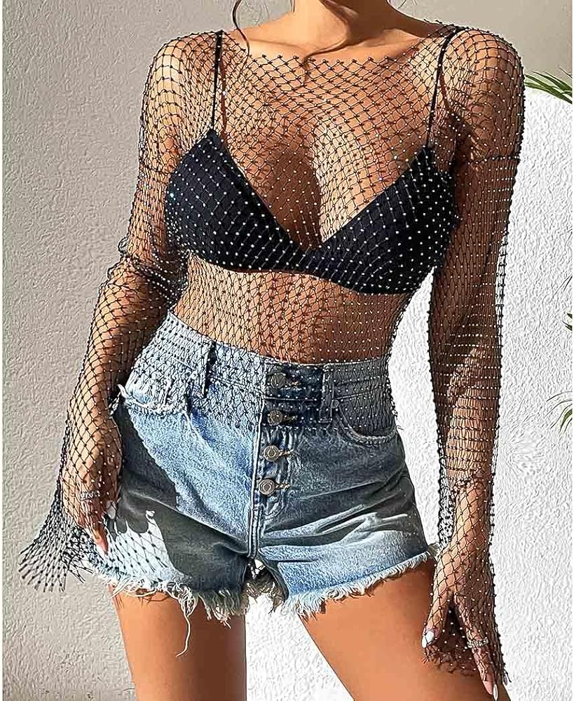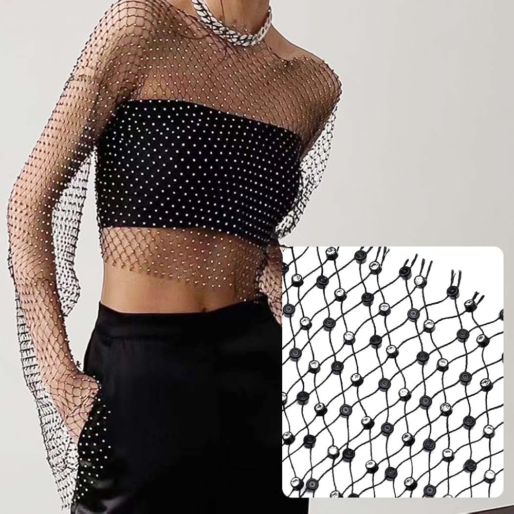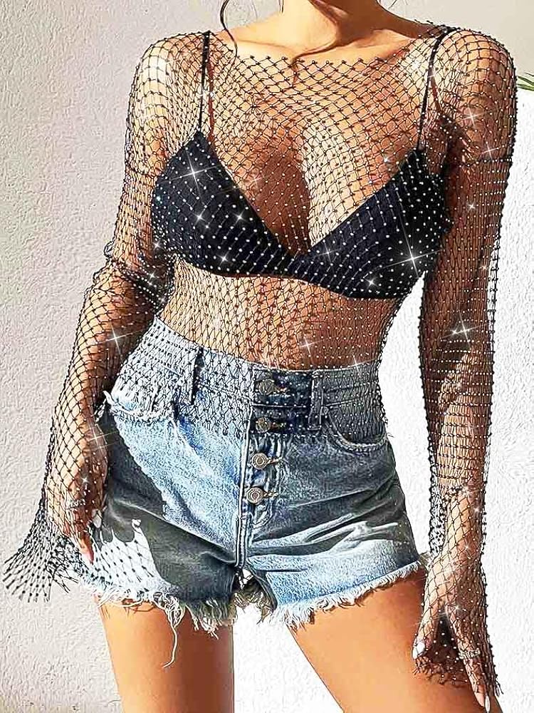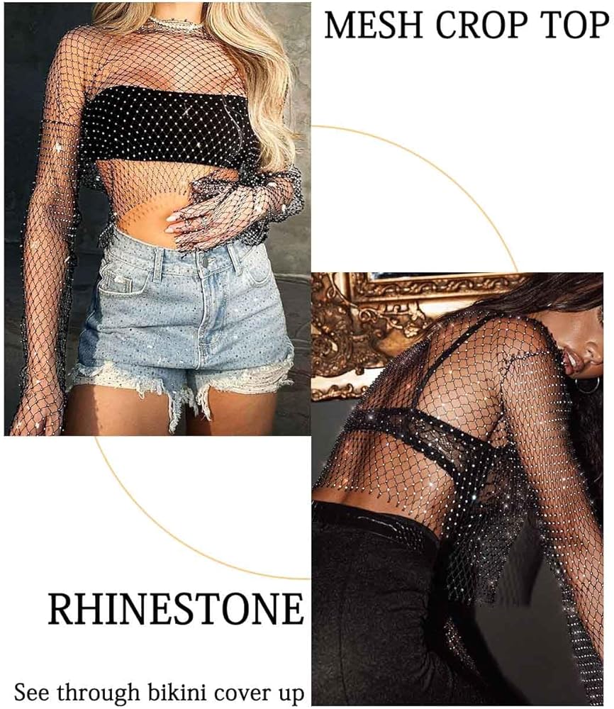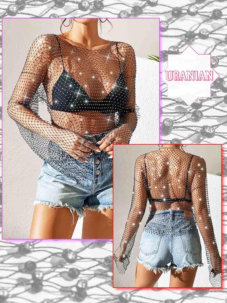Rhinestone Fishnet Cover Up for Women Features: Materials: Polyester and Rhinestones, lightweight, skin friendly, stretchy. Sparkly See Through Shirt---Shiny rhinestone tassels on both shoulders, Wear rhinestone crop top with bikinis, halter tops, pasties, tube tops, bralette, show off your sexy body. Fashion mesh tank top an ideal choice for rave party, club, concert, carnival, festivals,vacation, travel, prom, Halloween party, celebration, birthday dress, beach, ect,. Purchase Instructions: 1. Please do not machine wash, do not rub and pull hard; 2. Please confirm the size before purchase; 3. Due to the difference in manual measurement, please allow a slight size difference; 4. If you have any problems with the products you received, please feel free to contact us, we will certainly solve for you.