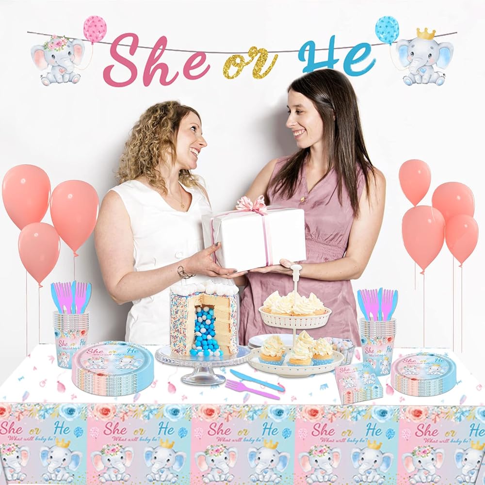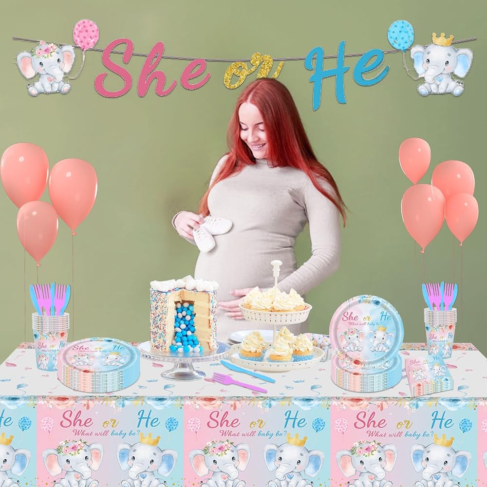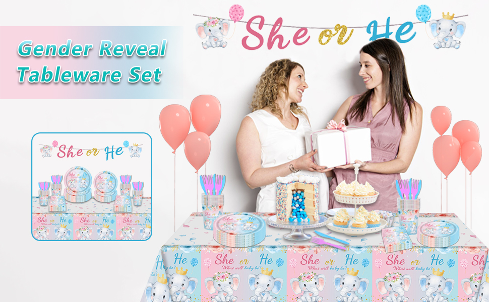 Cute Blue and Pink Elephant Design: Our baby gender reveal party supplies feature a combination of blue and pink patterns, Added many lovely patterns, such as wearing flower crowns and king crowns of elephants, balloons, bows, roses, etc. the baby gender reveal paper plates tableware set printed "She or He". More people can participate in the gender reveal party to enjoy the fun and inspire everyone's enthusiasm.