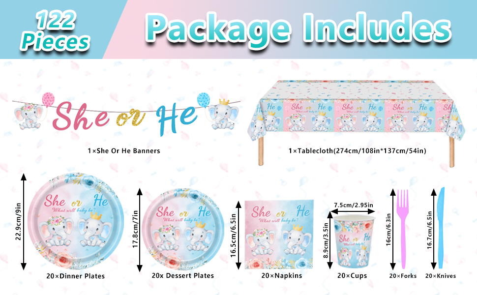 Gender Reveal Supplies Serve 20: This gender reveal birthday party tableware set that serves 20 people has 122 pieces, including 20 x gender reveal dinner plates (9 inch), 20 x gender reveal dessert plates (7 inch), 20 x gender reveal cups, 20 x gender reveal napkins, 20 x cutlery (forks), 20 x knives, 1 x gender reveal tablecloth (54"x108"), 1 x banner. Meet all your gender reveal party decoration needs in one step.