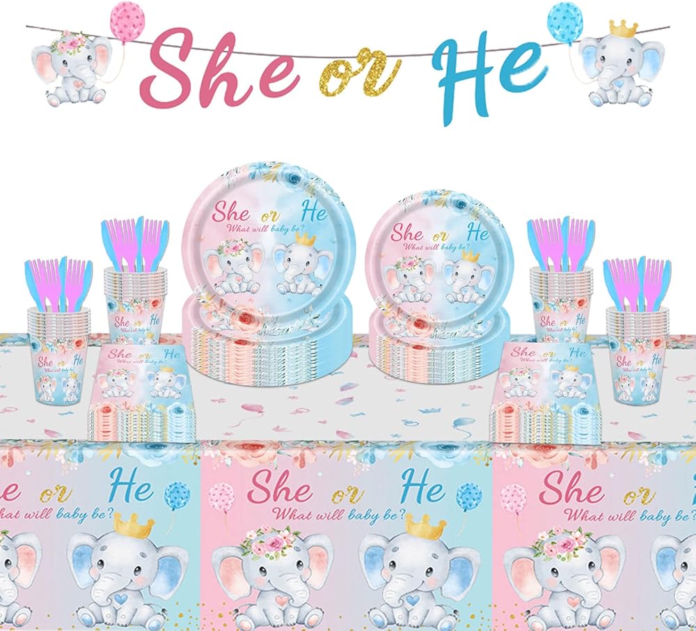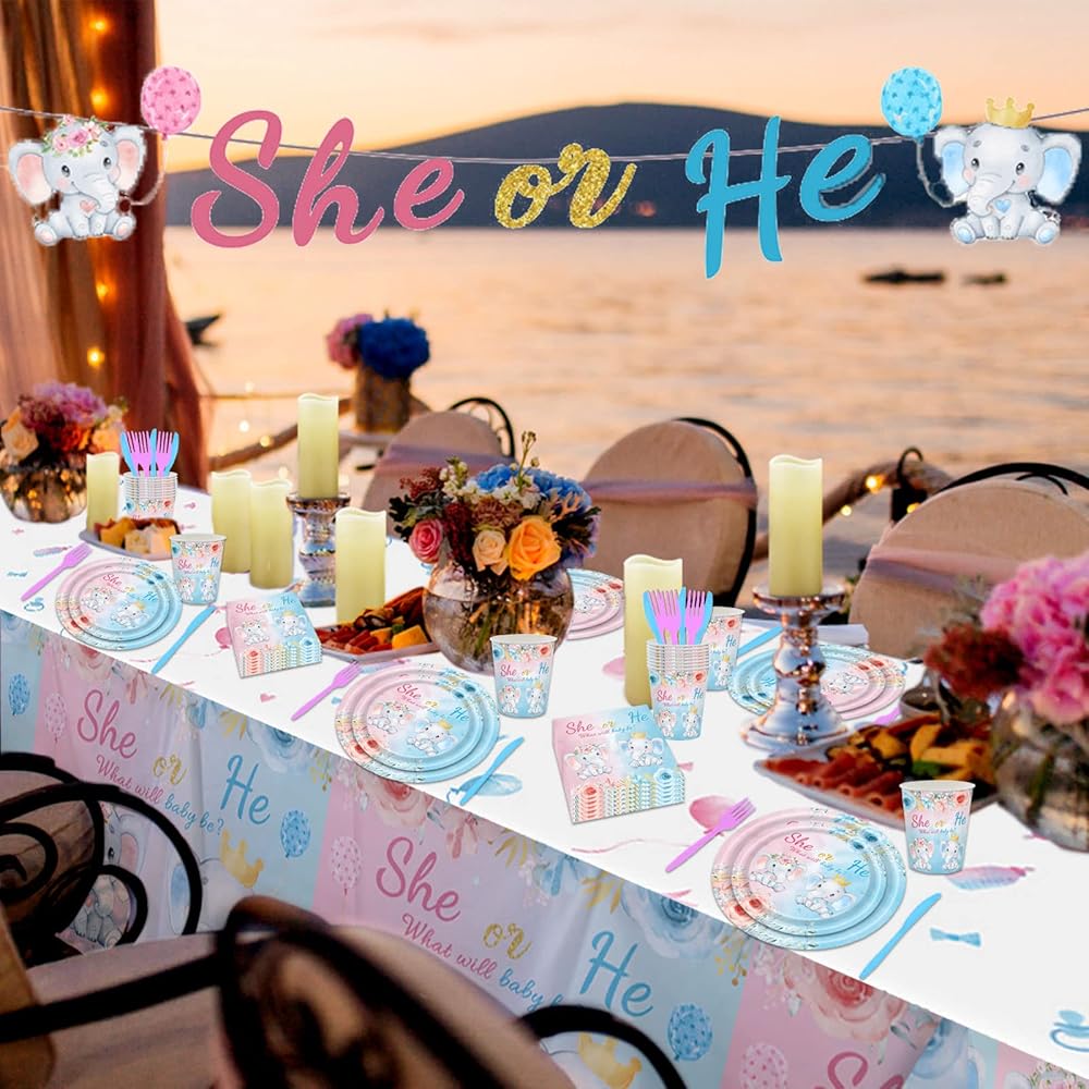 122PCS Gender Reveal Party Supplies Serve 20 Gender Reveal Party Decorations Blue and Pink Elephant Gender Reveal Tableware Set Includes She or He Banner Tablecloth Plates Napkins Cups Forks Knives