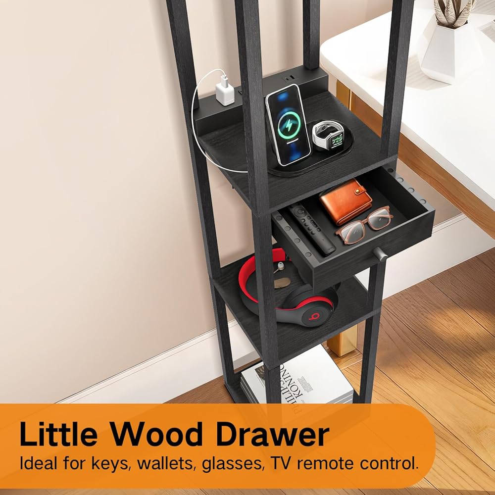 ✔【1 Drawer & 3 Shelves & Storage】: The 63.7-inch tall shelf floor lamp combines a nightstand with 3 large-capacity shelves and 1 large sliding drawer with knob. You can place the charging cable, remote control, sunglass, or some items easy to lose. Displaying your family photos, potted plants, and decorations. This increases the storage space, making the lamp more practical. Keeping your visual space neat and tidy. The standing lamp offers ambient illumination and style to any interior space.