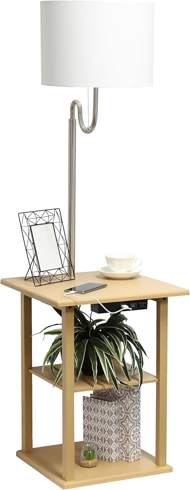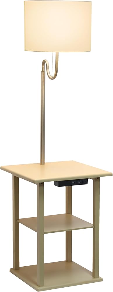Simple Designs LF2016-TAN 57" Modern 2 Tier End Table Floor Lamp Combination with 2 x USB Charging Ports & Power Outlet with White Drum Fabric Shade for Bedroom, Living Room, Office, Tan