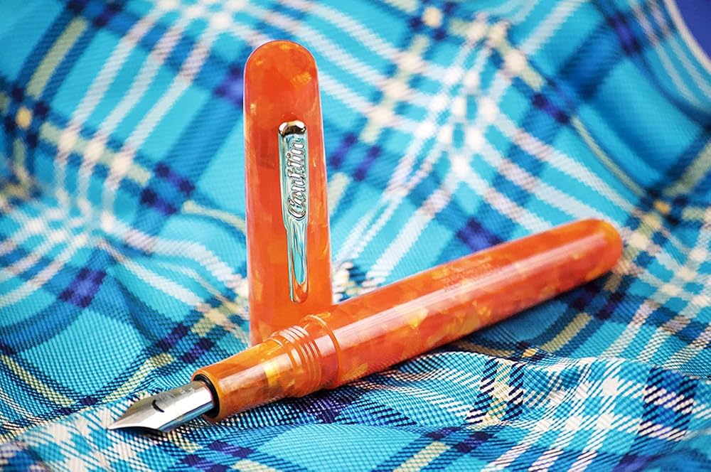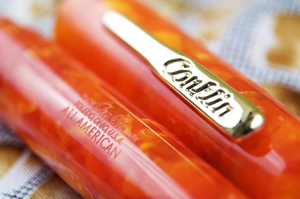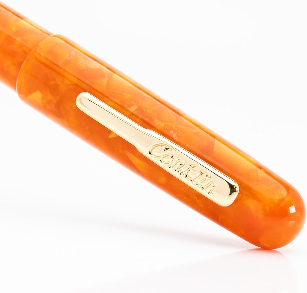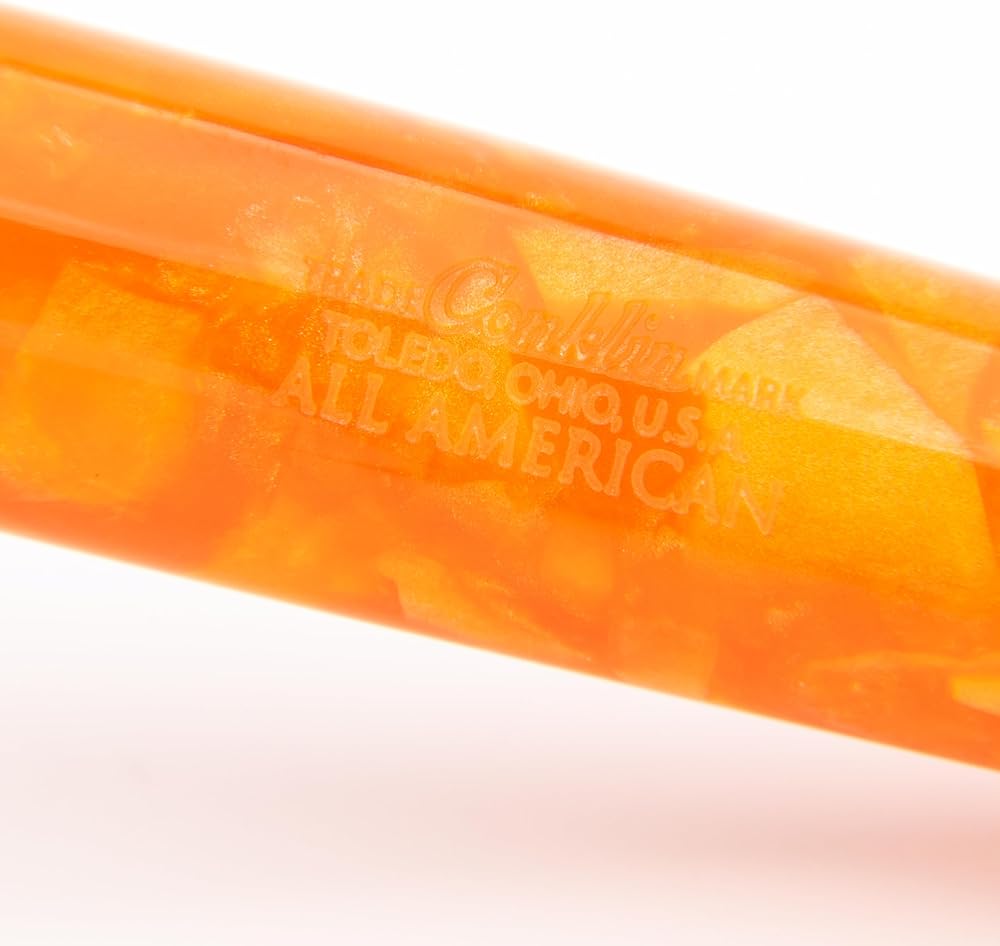 The Conklin pen company was established in 1898 and is still regarded as one of the most significant and innovative manufacturers from what is today known as the Golden era of fountain pens. During the 1930S, at the dawn of the depression, Conklin launched a collection that was priced more affordably to the general public. The 'all American' collection was offered in a variety of sizes, filling mechanisms and finishes with the aim of satisfying a growing market demand for good quality, but affordably priced writing instruments. Drawing inspiration from Conklin original models and the rich heritage of the brand, our new all American collection brings a vibrant, contemporary style to a timeless oversize streamlined design. Crafted from hand made European high grade resins, the all American is impressively large in size, yet not so big as to be uncomfortable in the hand. The cap and barrel are carefully tapered to provide a perfect balance. Offered in a choice of three finishes: vibrant Sunburst Orange, classic tortoiseshell and the energetic Yellowstone, the all American pays homage to the classic designs of the Vintage Conklin era. Sunburst Orange features vivid shades of deep Orange set off by shimmering bright pearl highlights. Tortoiseshell offers a classic Vintage look with a rich semi-translucent cream and Brown mixture. Yellowstone is a bold and beautiful mix of pearl white, rich Brown, and contrasting splashes of glowing Yellow. The tapered cap tops features the famous 'rocker style' clip and the barrels are engraved with the Conklin trademark and the 'all American' logo. The all American collection meets the requirements for those who want a large pen, one that stands out in a crowd, but which still stays true to the classic style and feel of the original Conklin designs.