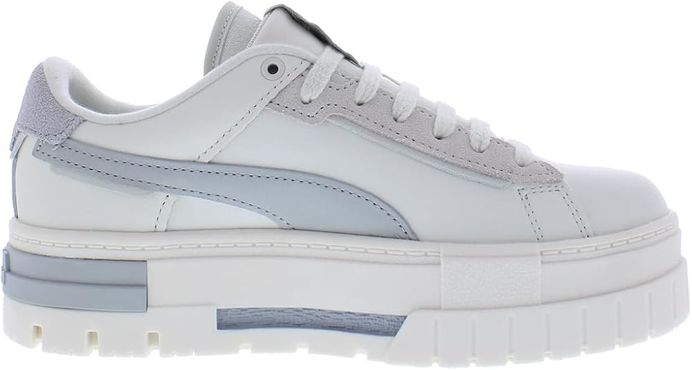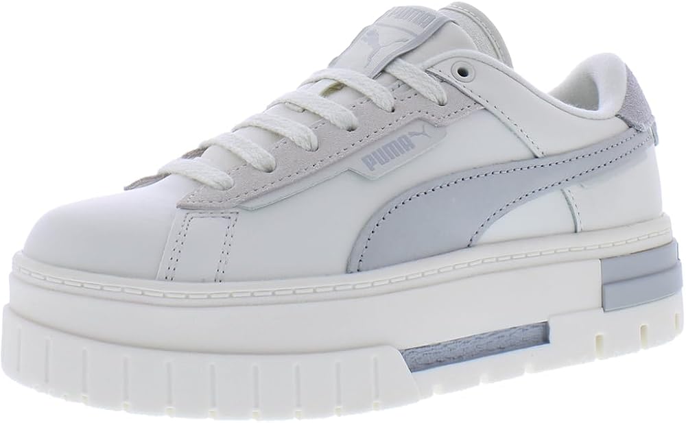 Add sportiness to your look wearing PUMA Mayze Crashed Sneakers. These sneakers come with a leather with synthetic upper, textile lining, and comfortable footbed. They feature a round toe shape, laces for adjustability, and signature branding for adj