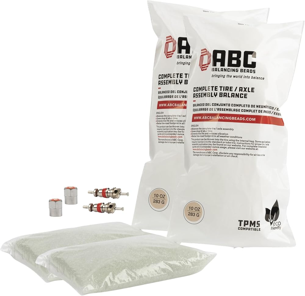 Easy to Use - ABC's drop-in bag can be installed through the valve stem in 5 easy steps without removing the tire and wheel from the vehicle. Contents or kit includes 4 - 14oz bags of our premium glass balancing beads, 4 valve cores, and 4 valve caps — the best tire accessory for light, medium trucks, or off-road vehicles.