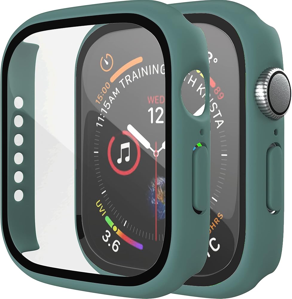 2 Pack Hard PC Case with Tempered Glass Screen Protector Compatible with Apple Watch Series 7 41mm Case, Ultra-Thin Scratch Resistant Overall Protective Cover for iWatch Men Women, Midnight Green