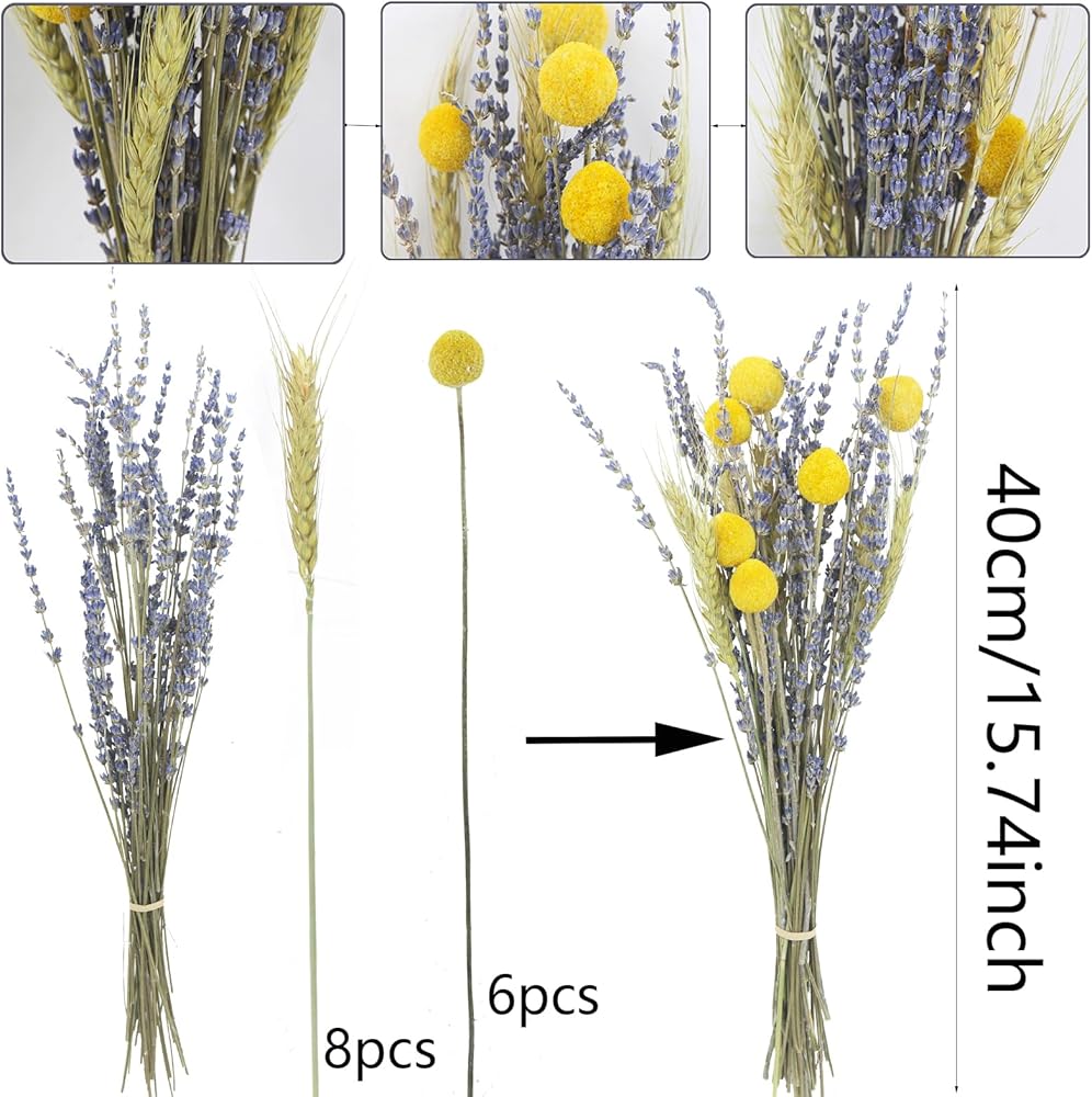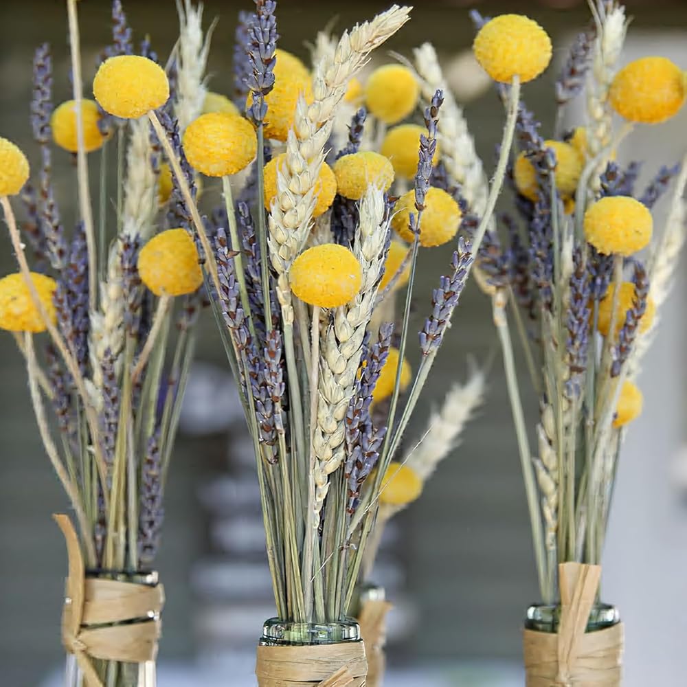 Most notably, our wheat bouquet has added dried lavender and golden craspedia, making the entire bouquet more unique.