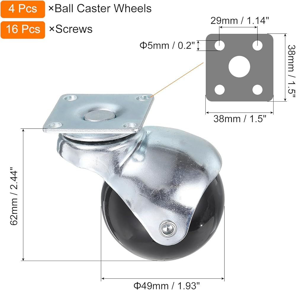 Wheel Diameter: 49mm / 1.93"; Installation Height: 62mm /2.44"; Plate Size: 38 x 38mm / 1.5" x 1.5"(L*W); Mounting Hole Distance: 29mm / 1.14"; Mounting Hole Diameter: 5mm / 0.2"; Package Content: 4pcs x Ball Caster Wheels, 16pcs x Screws