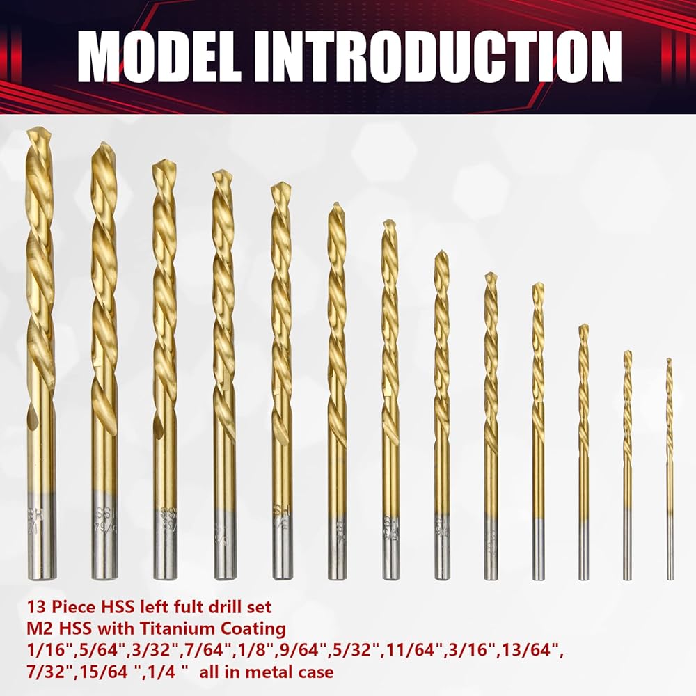13PCS Left Hand Drill Bit Set 1/16"-1/4" Titanium Twist Reverse Drill Bits Fit for Cutting Metal, Cast Iron, Hard Plastics and Wood, and Softer Materials