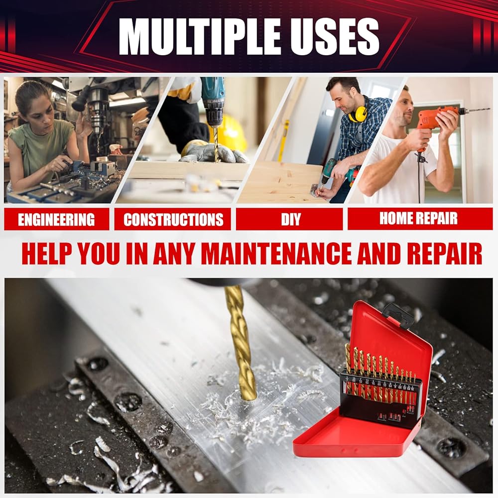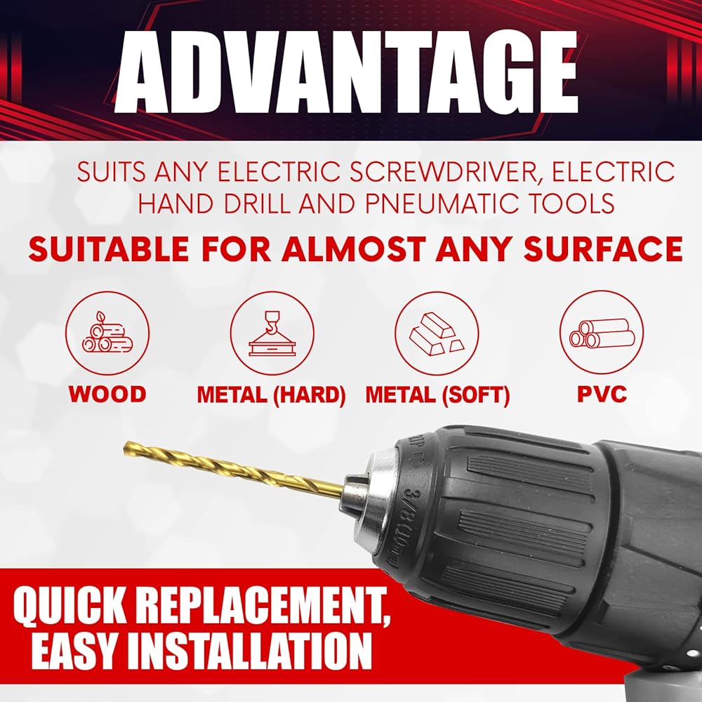 [Material]: Twist drill bits feature classic HSS construction and titanium coating for superior performance and durability.