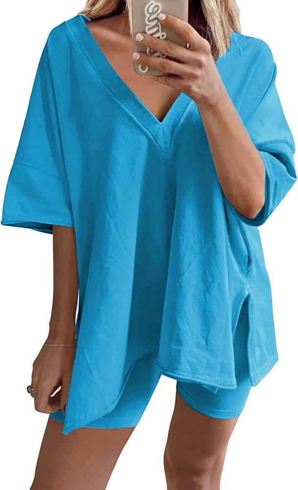 • Summer two piece outfits tracksuit for women, loose fit t shirts top, casual biker shorts