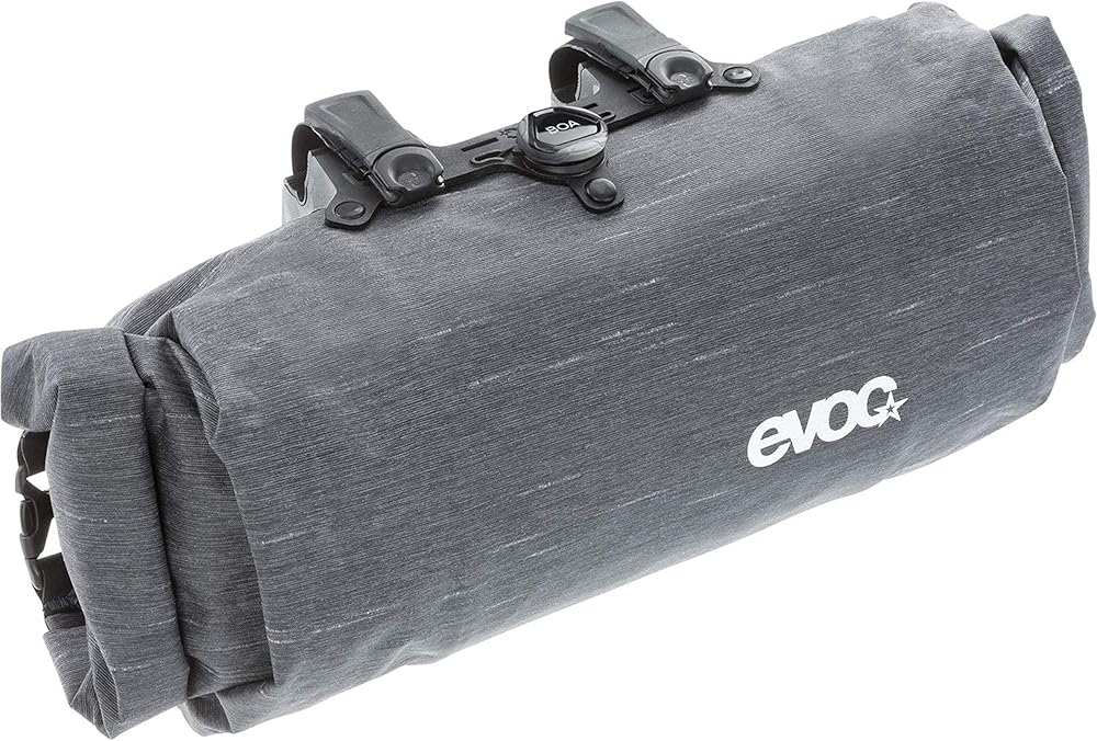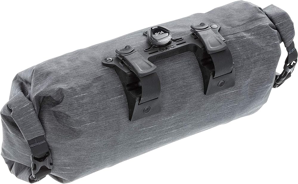 When our rides start to get longer and cover more weather systems, we need the storage space to carry all our fuel and layers in a compact manner. EVOC's BOA Handlebar Pack provides just that in an innovative package. Unlike most handlebar packs that attach with a maze of webbing and hook-and-loop straps, EVOC uses a single BOA dial, which tightens two straps. This simple design makes attaching and removing the pack far faster than other systems, so we can get on the road far sooner and with less fuss. The attachment also moves the bag out from the handlebar to better clear brake and shift cables. The pack's double-sided roll-top design both allows us to control the volume of the bag and access contents from either side. When the skies grow dark with clouds, we can trust the waterproof fabric will keep our things high and dry, while the durable nylon will last through miles and miles of off-road riding.