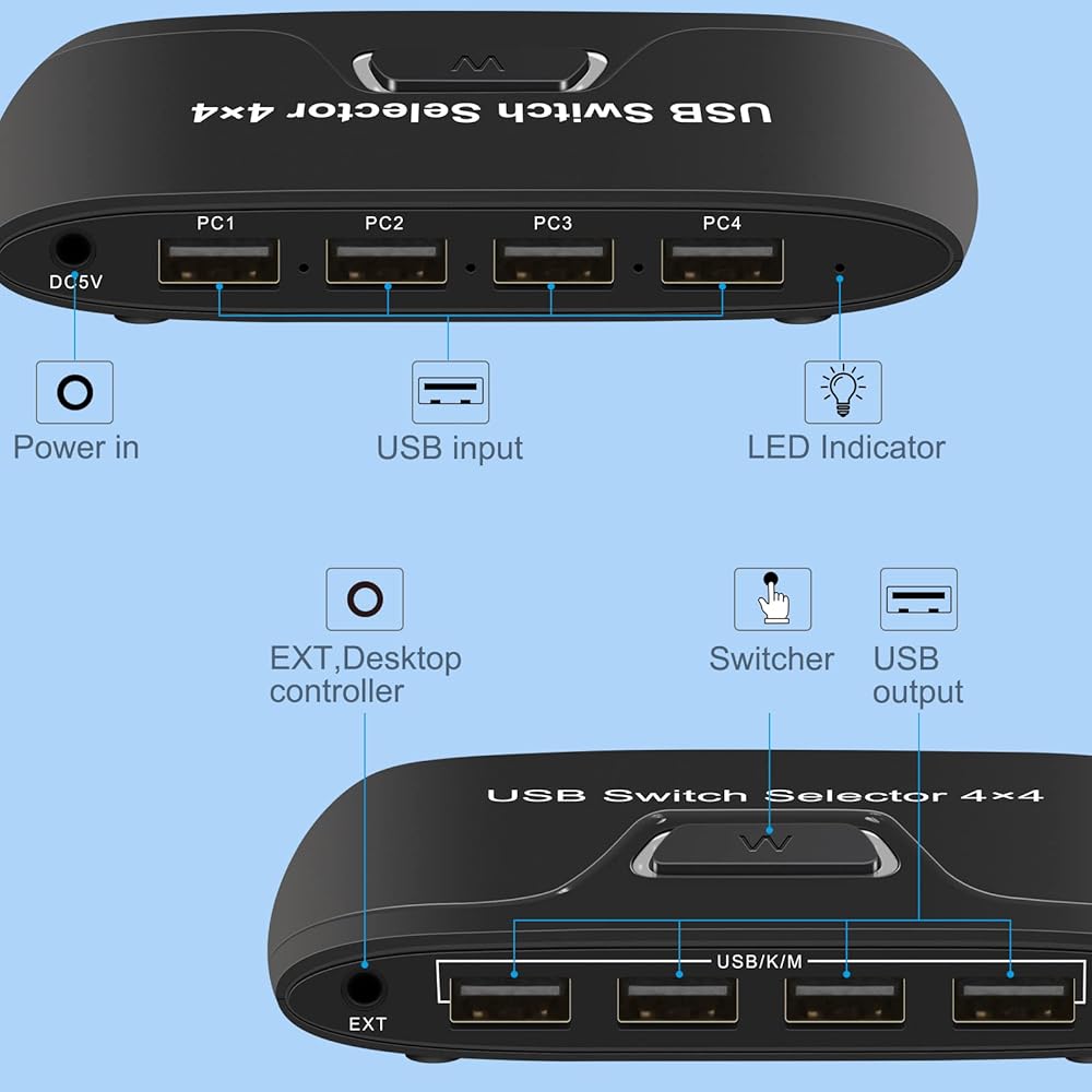 【Ideal for Sharing Multiple Peripheral Devices】Such as printer, scanner, mouse, keyboard, card reader, flash drive and other USB devices between 4 computers.