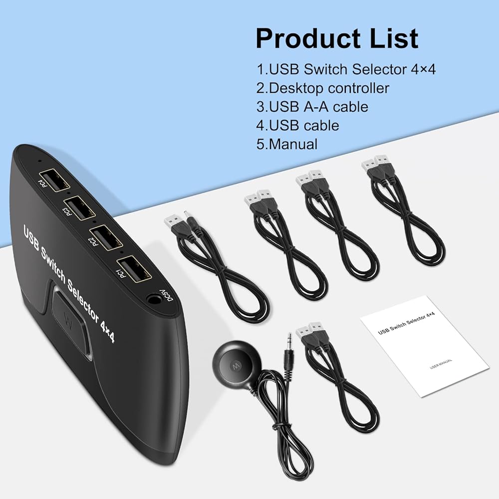 【NOTE】When using a high-power USB device,such as HDD, Digital Video Cameras, SSD etc.,external 5V adapter is required. You will get: 1*USB 2.0 switcher selector, 4*USB 2.0 A-A Cable, 1*desktop controller, 1*DC power cable, 1*User Manual. (Power adapter not Included).