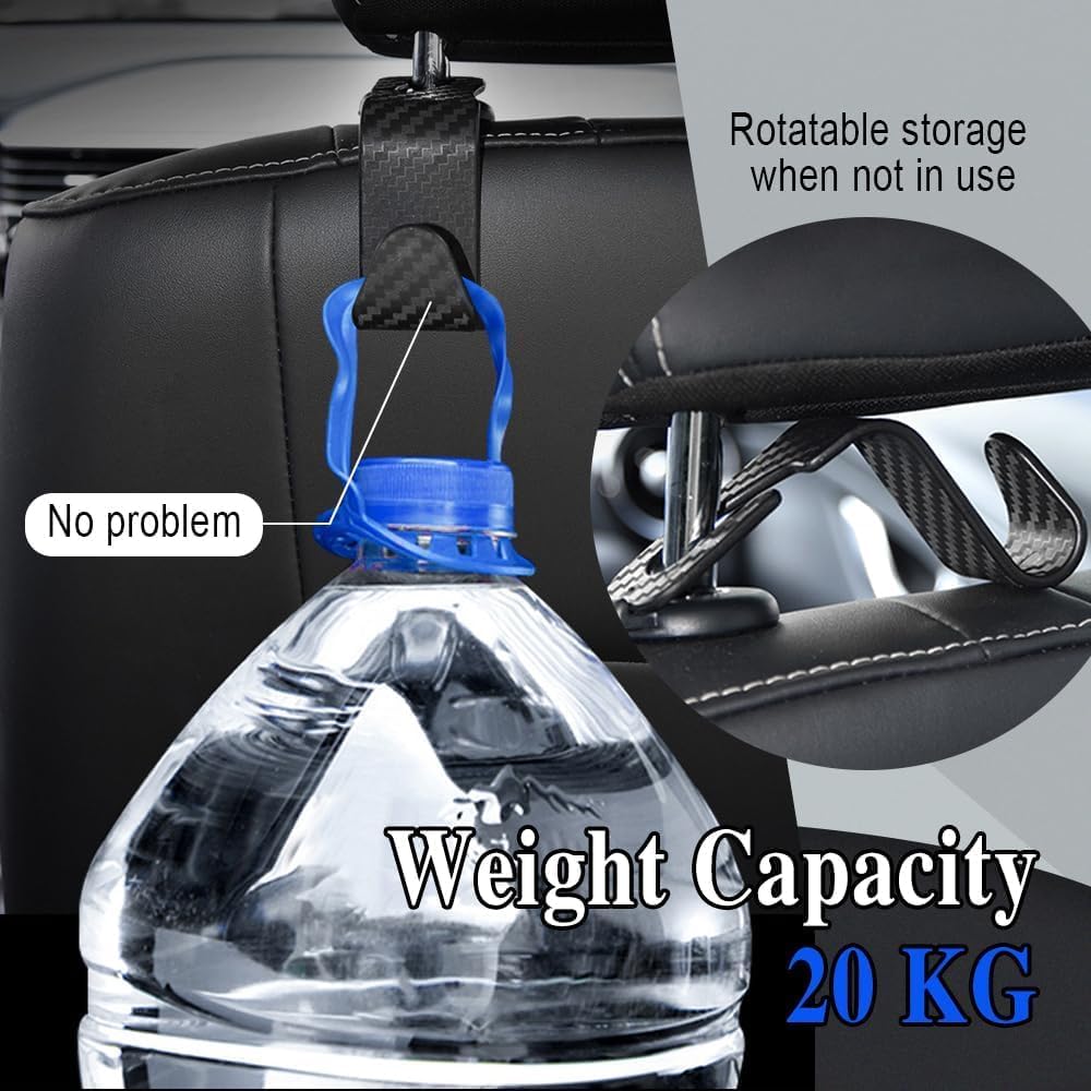 [High quality materials]: The carbon fiber hook on the Plastic Matetrial.It has excellent toughness, wear resistance, heat resistance and high hardness. It can reach 30KG super load bearing, very durable, not easy to break, not easy to deformation. And it is universal, and it can work on all car models. You can use it to hang groceries, clothes, Umbrella,handbags, school bags, shopping bags, whatever you want to put away.