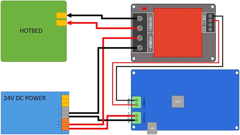 - 2.Hotbed connected to the hot bed heating line, pay attention to positive and negative.