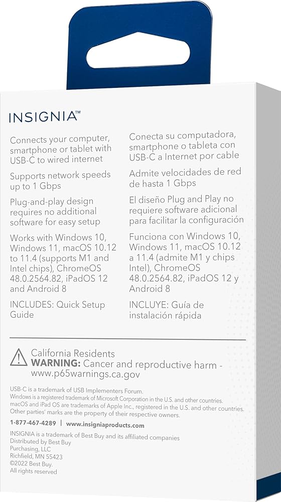 There's nothing more frustrating than slow internet. Whether you're trying to get work done or browsing the web, your internet connection should always be seamless. The Insignia USB-C to Ethernet Adapter provides high-speed internet access to USB-C devices such as computers, smartphones, tablets and more. It supports up to 1 Gbps, granting high-speed data transfer and fast connectivity, which improves your gaming or web browsing experience. Plug-and-play technology ensures a simple connection and LED indicators tell you the adapter is connected and ready to go. It's also easy to take on-the-go, with a compact design that easily fits in your pocket or purse. Secure a fast connection and forget about slow internet with this Insignia adapter.
