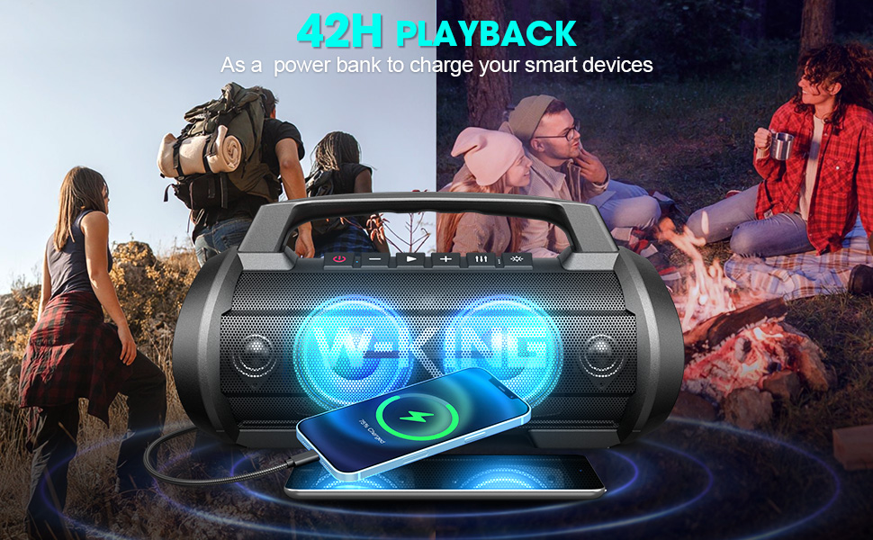 42H PLAYBACK & IPX6 WATERPROOF & POWER BANK: W-KING D10 waterproof bluetooth speaker has a large-capacity battery to support 42h playback (minimum volume) and sturdy handle makes it easy to take anywhere. As a power bank to charge your smart devices, so that you will never miss any message. IPX6 waterproof and shockproof makes the waterproof bluetooth speaker suitable for outdoor activities and the passive radiators covers prevent accidental bumps and drops.
