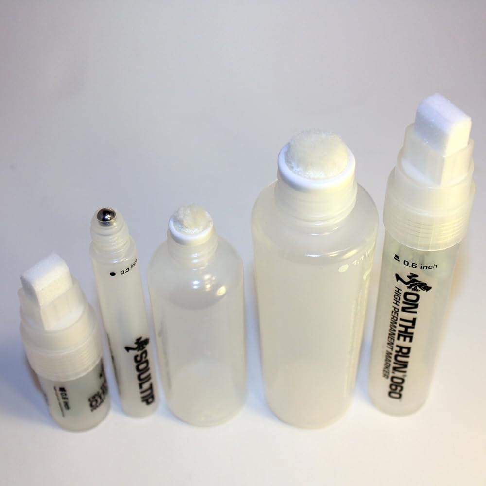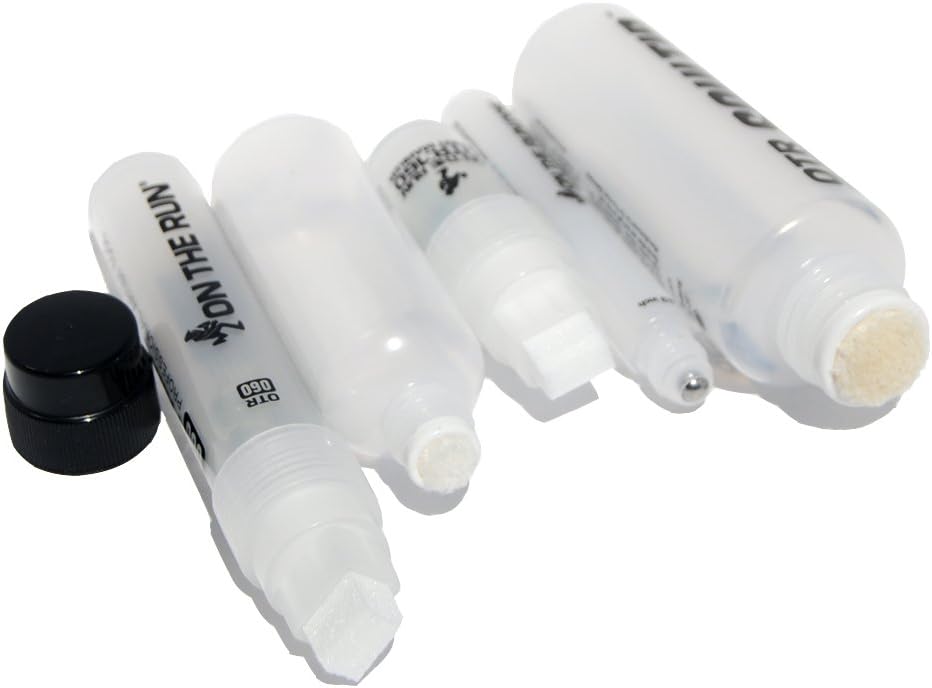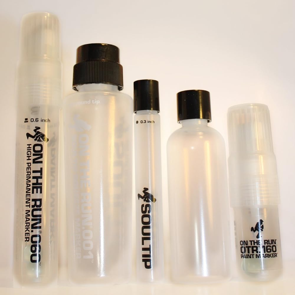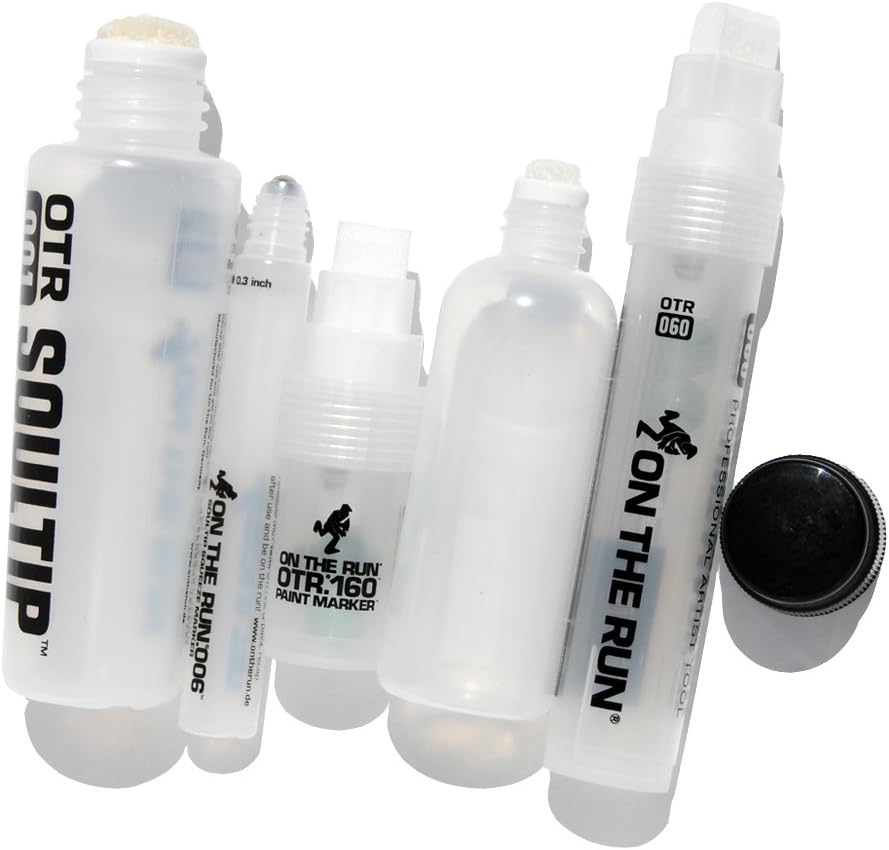 The OTR. Mop / Marker Pack is a great way to sample some of the best empty markers available on the market. This pack features the famous (1) OTR.001 (Soultip), (1) OTR.004 (Soultip squeeze 70ml No logo), (1) OTR.060 Jumbo Marker, (1) OTR.160 (mini pump maker) and (1) OTR.006 Steel nib (Soultip 15ml). The Mop pack is a convenient and cheap way to find out why the On The Run markers are so famous. These mops ship EMPTY! For optimal performance refill them with OTR.401 Paint or OTR.484 Flowpen ink. OTR. paints and inks are vibrant and wildly effective.