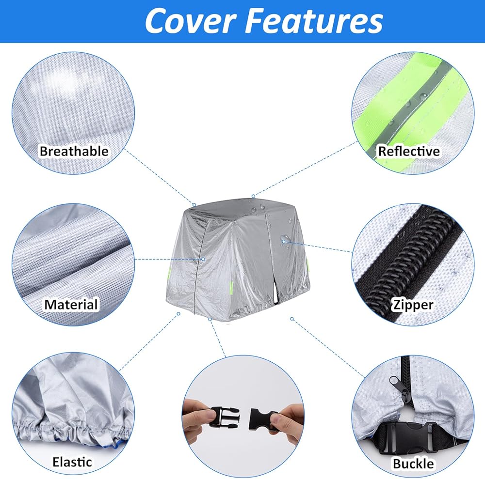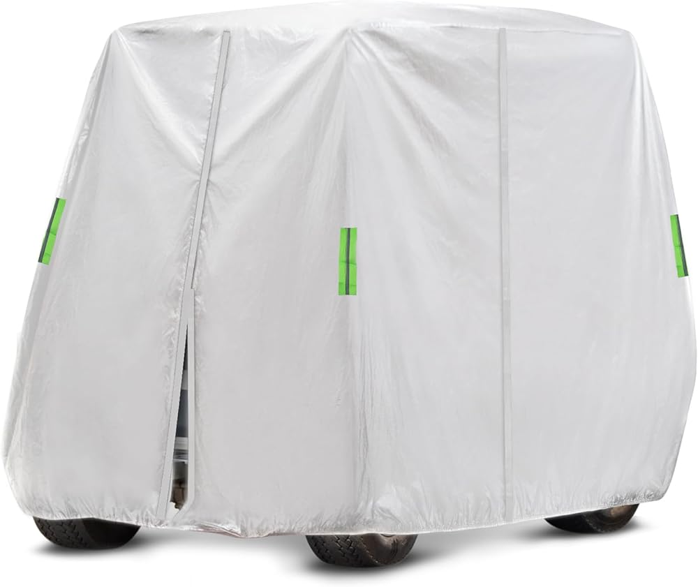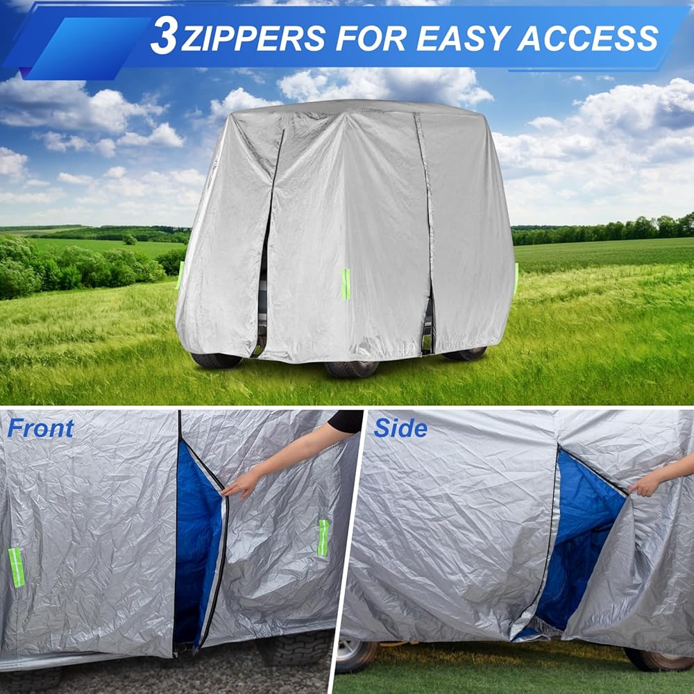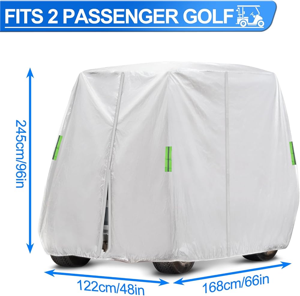 【Premium Material】 This durable 4 passenger golf cart cover is made of high strength 210D oxoford fabric with vinyl coating, water resistant, anti-UV, tear-resistant and dust proof. Can effectively prevent the sunlight from aging the cart.