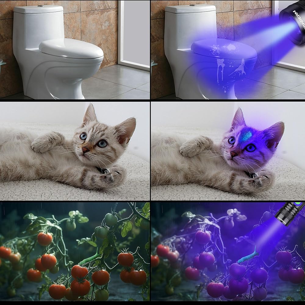 • ★【ZOOMABLE LENS & READY FOR YOUR NEED】-- Zoom in/ out to adjust suitable light range. Enlarge the beam to circle the suspected area and narrow down to mark pet dog / cat urine. Easier Operation with ONLY One Lighting Mode -- Just click to turn ON/OFF the blacklight flashlight. The case uses reliable and durable aluminum alloy with great heat dissipation performance and no fear of falling.