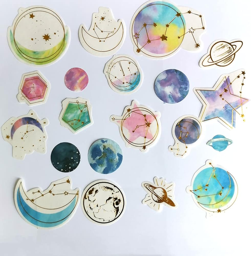 Kawaii Gold Stamping Washi Sticker Set Constellation Starry Sky Planet Stars Stickers for Scrapbooking Journaling Art Craft Planner Diary Album Card Letter Envelope Gift Wrapping