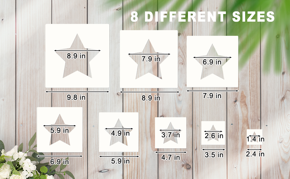 DIFFERENT SIZES The star templates come in 8 sizes, 2 sheets for each size, with different outer and inner lengths, including 9.8 × 8.9 inches, 8.9 × 7.9 inches, 7.9 × 6.9 inches, 6.9 × 5.9 inches, 5.9 × 4.9 inches, 4.7 × 3.7 inches, 3.5 × 2.6 inches, 2.4 × 1.4 inches.