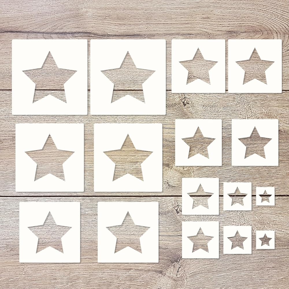 مقاسات مختلفة تأتي قوالب النجوم في 8 مقاسات، ورقتان لكل مقاس، بأطوال خارجية وداخلية مختلفة، بما في ذلك 9.8 × 8.9 بوصة، 8.9 × 7.9 بوصة، 7.9 × 6.9 بوصة، 6.9 × 5.9 بوصة، 5.9 × 4.9 بوصة، 4.7 بوصة × 3.7 بوصة، 3.5 × 2.6 بوصة، 2.4 × 1.4 بوصة.