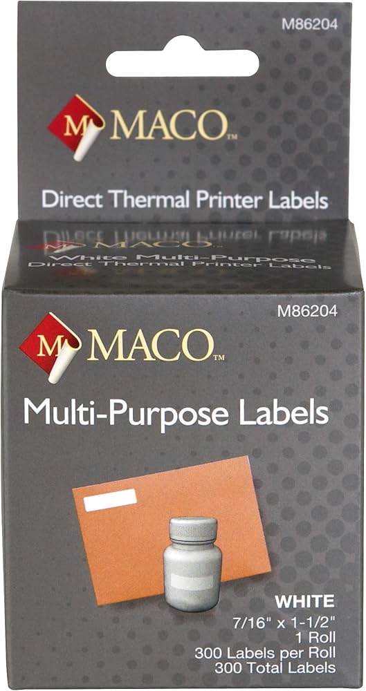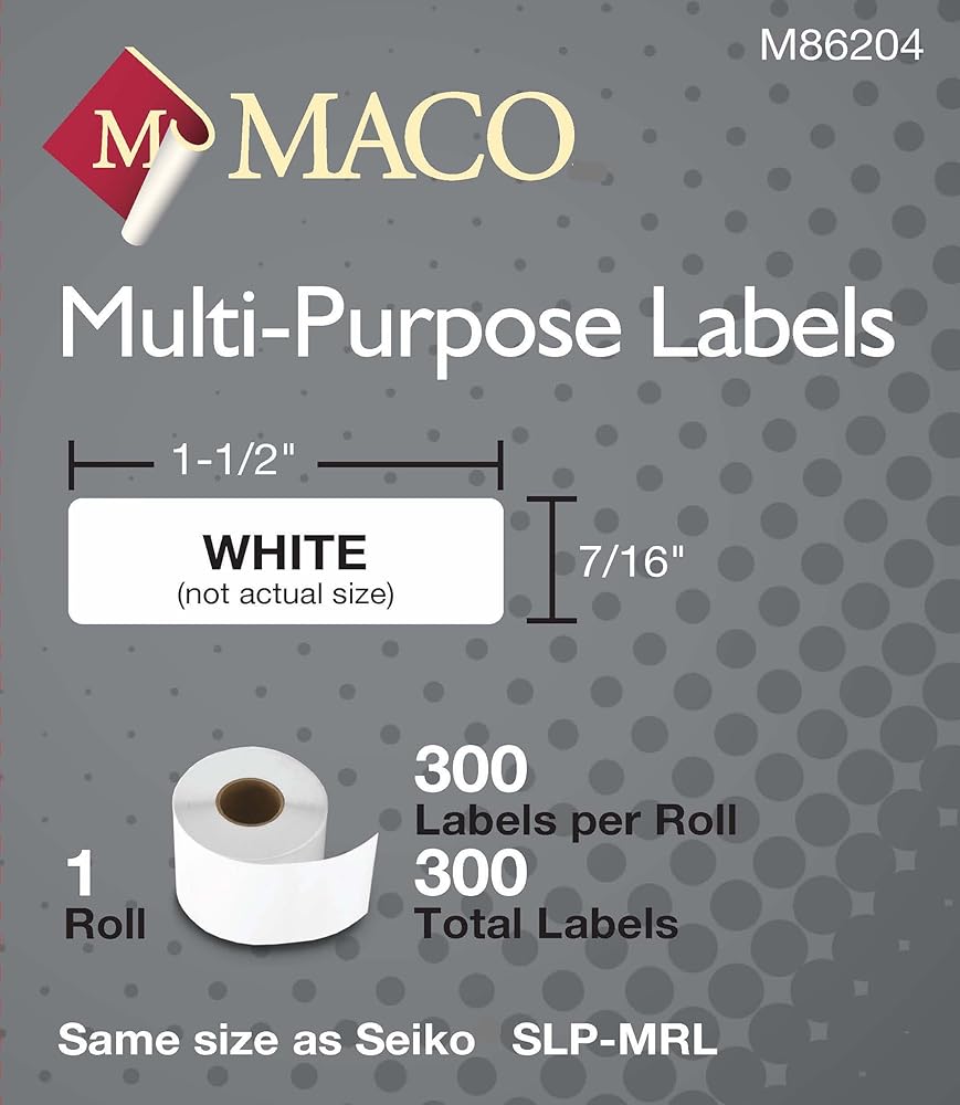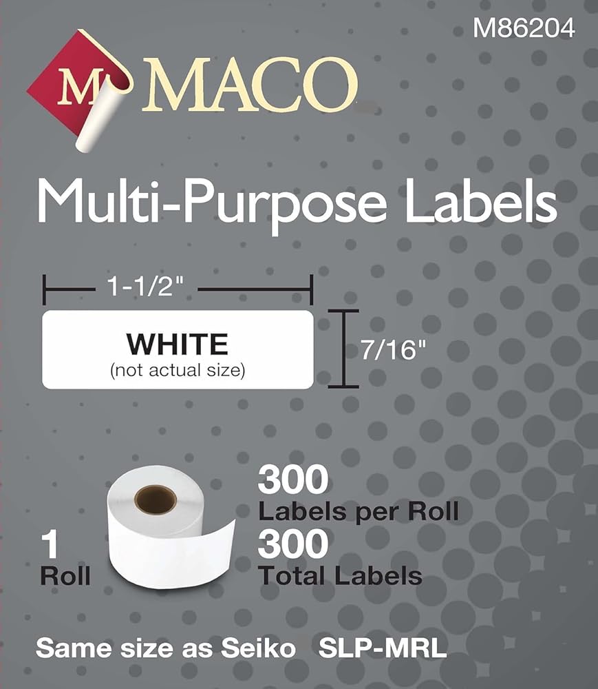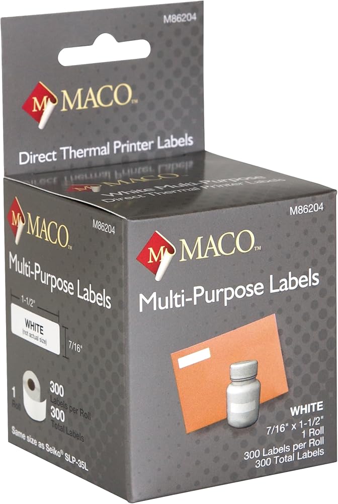 MACO Direct Thermal Printer White Multi-Purpose Labels are compatible in Seiko Smart Label Printers. These customizable labels feature bright white label stock that yields superb printing results. Label size: 1-1/8 x 2 inches. There are 220 labels per roll and are packed 2 rolls per box. MACO has been providing quality products to the business community since 1916. Their office products truly offer a blank canvas for creative business solutions.
