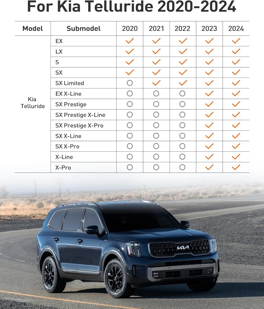 Perfect Fit & Coverage – Floor Mats and cargo mat for kia telluride 2020-2024 adopt adaptive technology to capture every corner and crevice for perfect fit and coverage. Perfect fit sub model like, EX, LX, S, SX, SX Limited, EX X-Line, SX Prestige, SX Prestige X-Line, SX Prestige X-Pro, SX X-Line, SX X-Pro, X-Line, X-Pro. Please remove original mat before you install the floor mats.