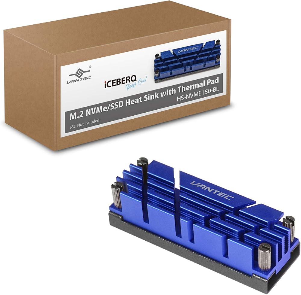 The Vantec ICEBERQ M.2 NVMe/SSD Heat Sink with Thermal Pad keeps your M.2 NVME/SSD cool near ambient temperatures by dissipating and protecting your M.2 module from heat. This High Vented Fins Heat Sink is easy to install on any standard M.2 2280 size module. It will help to extend your M.2 lifespan with a less likely chance of suffering from overheating failure. It keeps your M.2 Module within normal operating temperature to ensure it performs at peak performance during intense data usage. This Heat Sink is designed for Single or Double Sided M.2 NVMe/SSD and uses Dual Thermal Pads with rubber spacer to Dampen Vibration and provides full contact on both sides. The Spring Mount is easy to secure, designed to last, and will not break down. The Flat Base Heat Sink makes full contact with your M.2 Module for maximum heat dissipation for your whole module and it is available in Black, Red, and Blue Color Heat Sink.