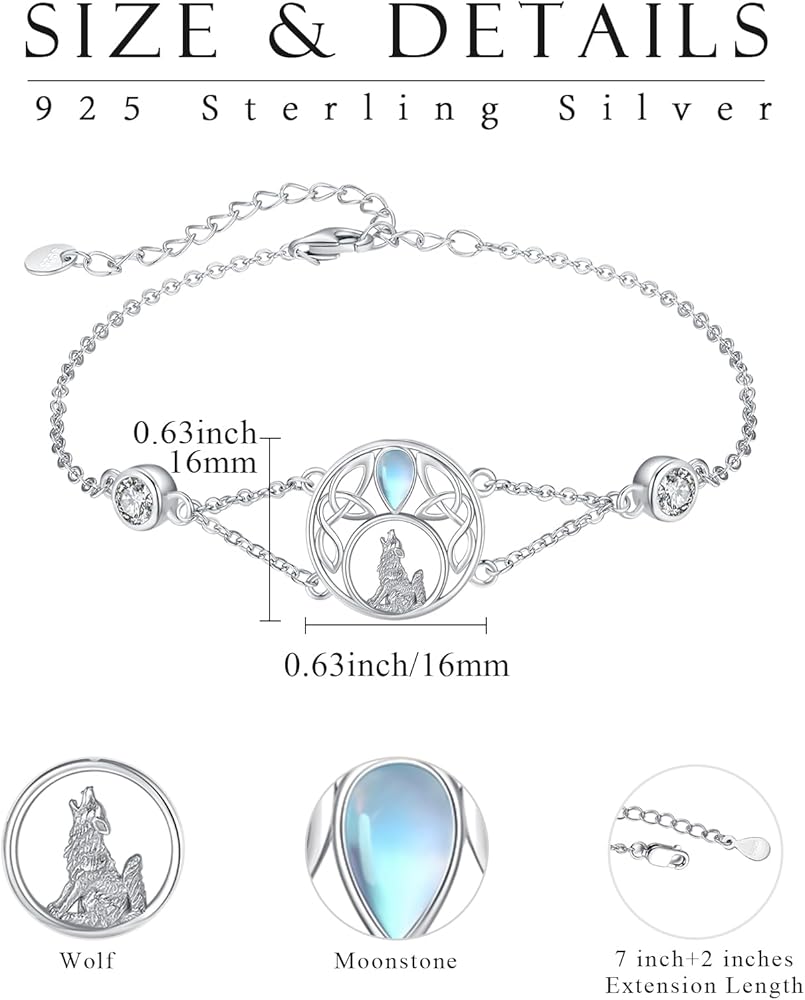 【Moonstone Wolf Bracelet Size】Forest wolf bracelet size is 0.63 inch*0.61 inch. Celtic wolf adjustable bracelet chain length is 7+2 inches extension chain, adjustable for your preference.