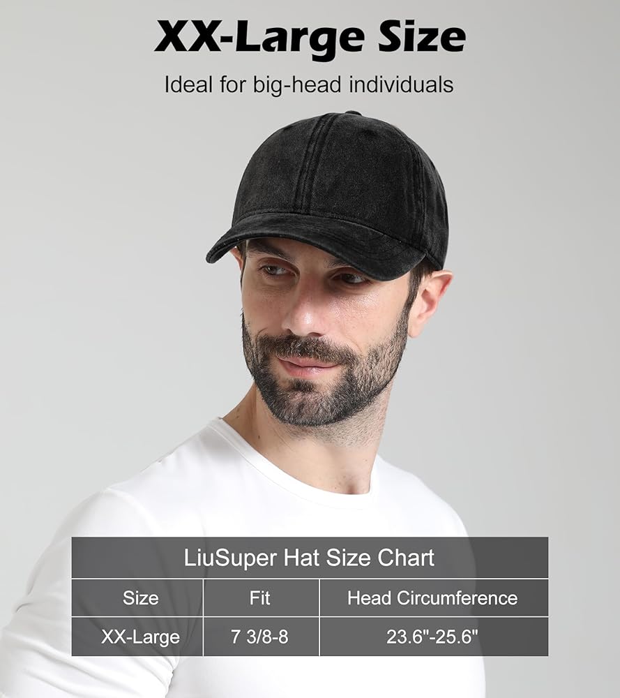 Introducing our latest creation, the LiuSuper XXL Baseball Cap. Designed specifically for those with larger heads, our caps offer both style and comfort in equal measure. Crafted from vintage washed distressed cotton, our dad hat boasts a classic and timeless look that never goes out of fashion.