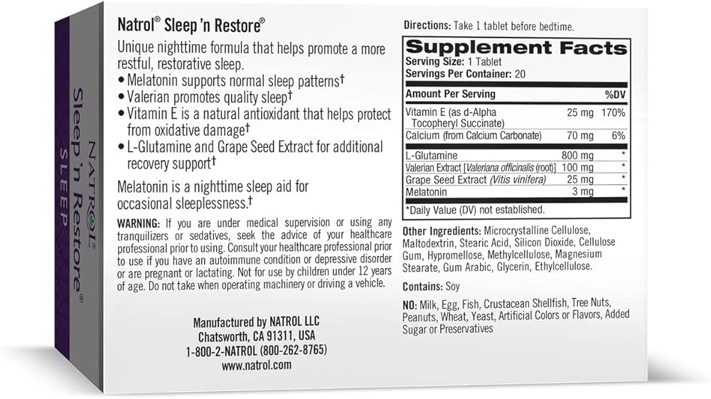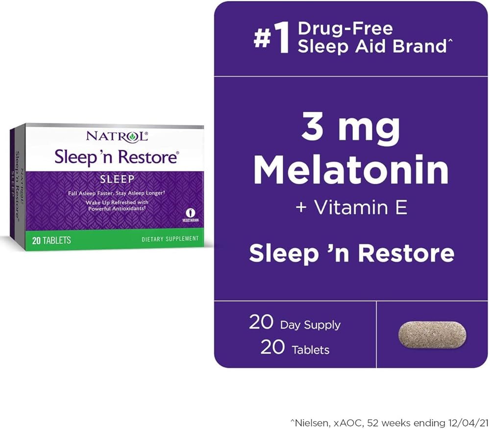 Natrol Sleep N Restore Sleep Support 20 Tablets (Pack of 6) - Natrol Sleep ‘n Restore is a nighttime sleep aid that assists with occasional sleeplessness and helps to establish normal sleep patterns while protecting your body from oxidative damage with powerful antioxidants. Melatonin serves as the body's biological clock, managing the sleep and wake cycles. Age, everyday stress, and diet choices induced by busy lifestyles can take a toll on the body's production of melatonin. Natrol Melatonin, the #1 melatonin brand in America, is a nighttime sleep aid that assists with occasional sleeplessness. It helps to establish normal sleep patterns to give you a more restful, relaxing sleep and in turn, better overall health. Natrol Sleep ‘n Restore is a comprehensive nighttime sleep aid that is packed with powerful antioxidants that can protect your body from oxidative damage induced by a hectic lifestyle. Melatonin is a key component of your body's "sleep-wake" cycle, signaling your body that it is time to sleep. Aging, stress levels, diet, exercise, and external factors such as blue-light emitting smartphones, tablets, and computers can disrupt and minimize our body's ability to produce melatonin. Natrol Melatonin helps you fall asleep faster, stay asleep longer, and wake up rested. ADDITIONAL INFORMATION: Please consult your healthcare professional prior to use if you have or suspect a medical condition, are taking prescription drugs, or are pregnant or lactating. Individual results may vary.