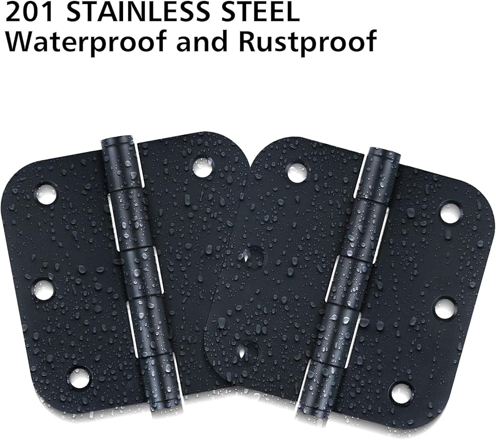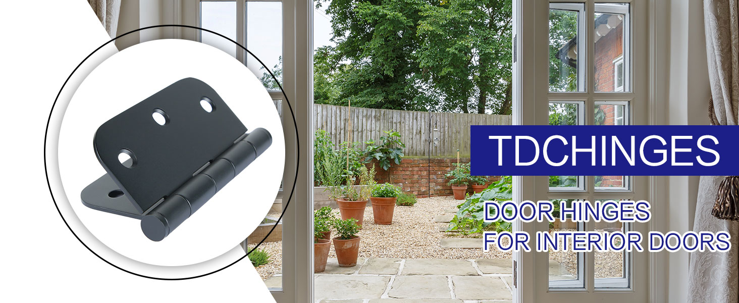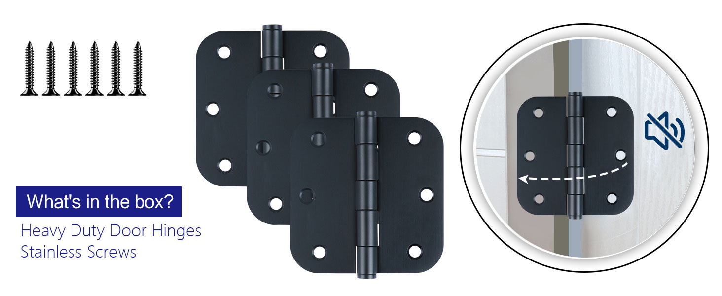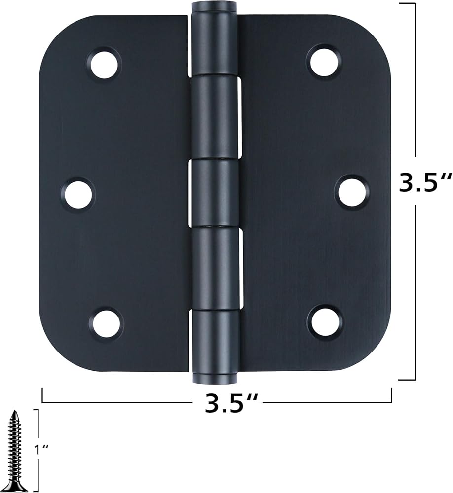 Door hinges Black Matte 3.5 inch with 5/8 rounded corners and 6 holes for front door,cabinet,wooden box.Safe black door hinges 3.5" Includes 18 free screws for quick and easy installation.Mat black door hinges can be rotated 270 degrees.