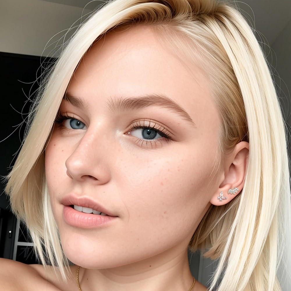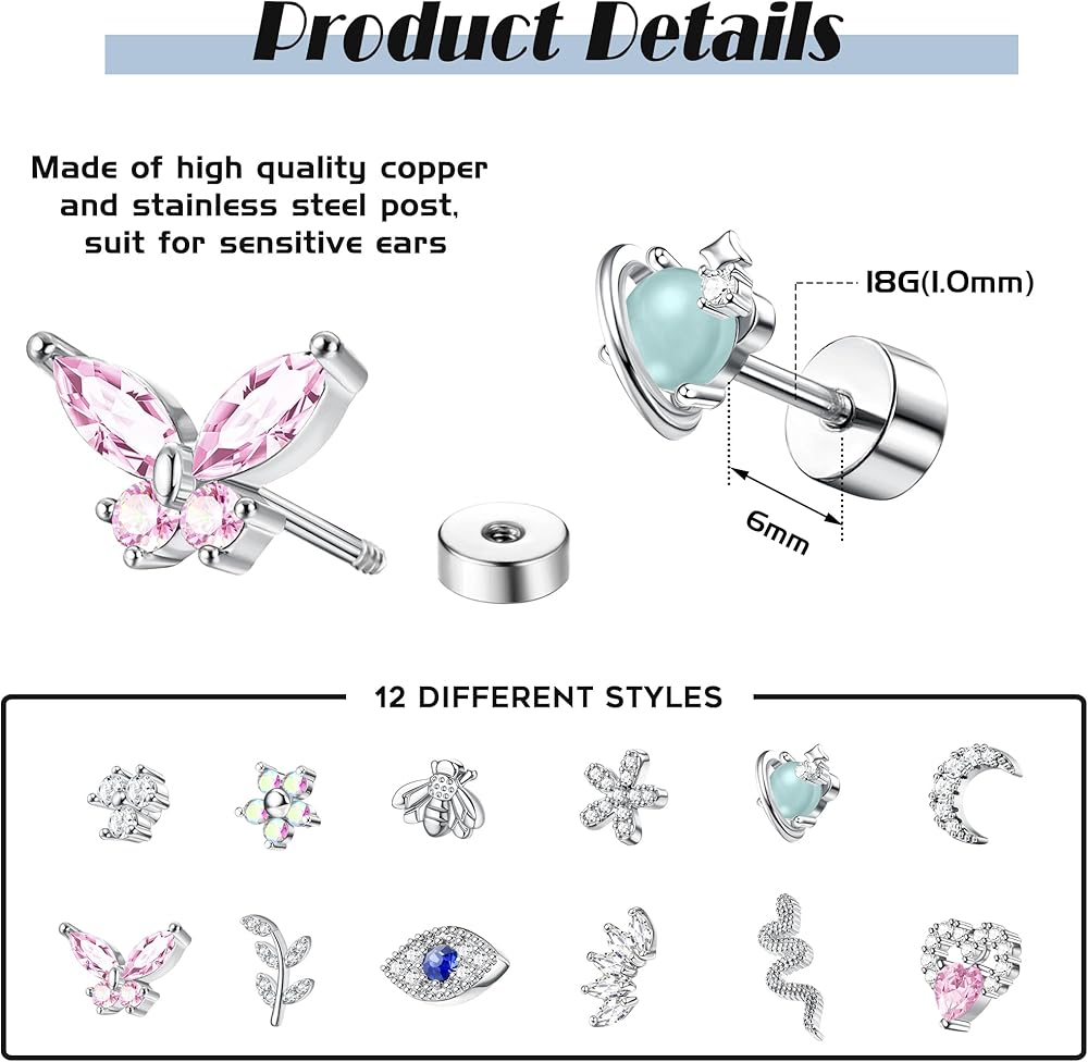 FINREZIO 12 قطعة 18 جرام من أقراط الغضروف المصنوعة من الفولاذ المقاوم للصدأ للنساء والرجال أقراط مسطحة الظهر على شكل قلب وفراشة عين الشر ثعبان صغير أقراط مسمار مسطحة على شكل زهرة الزنمة مجوهرات ثقب الحلزون 6 مم 8 مم