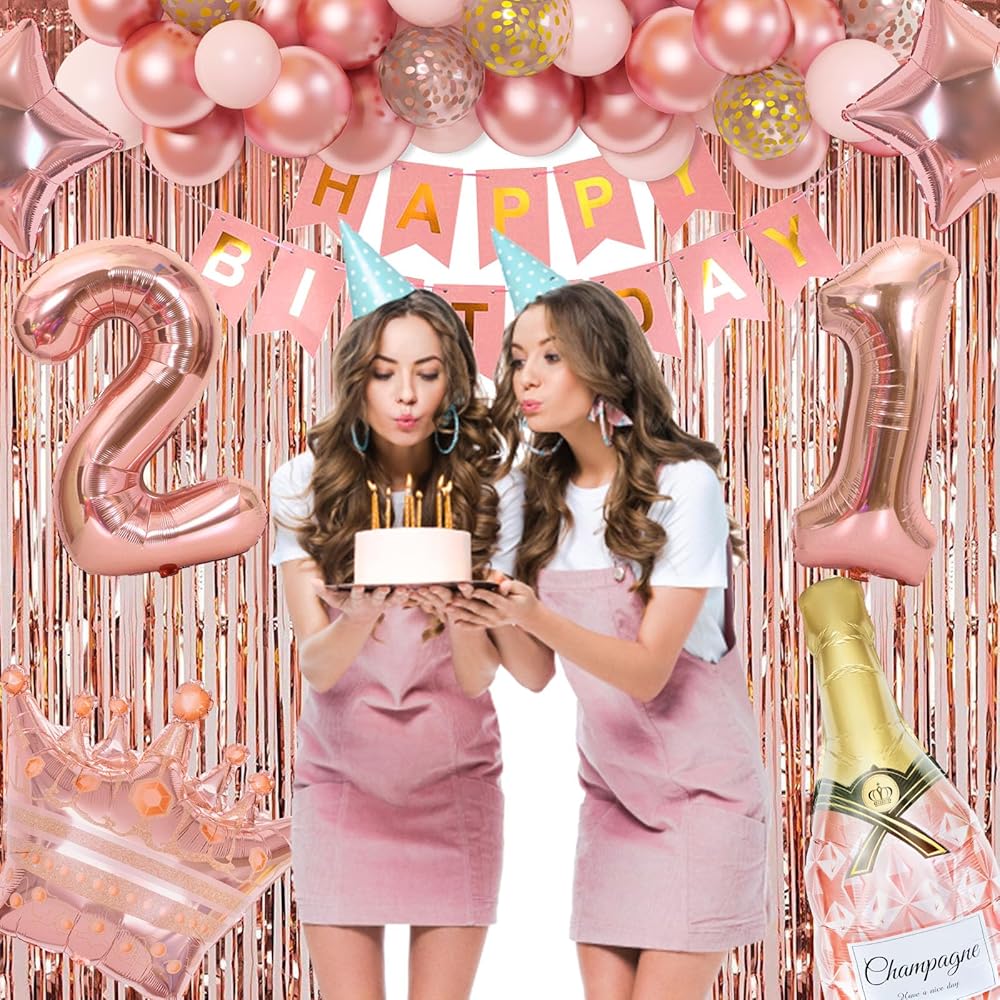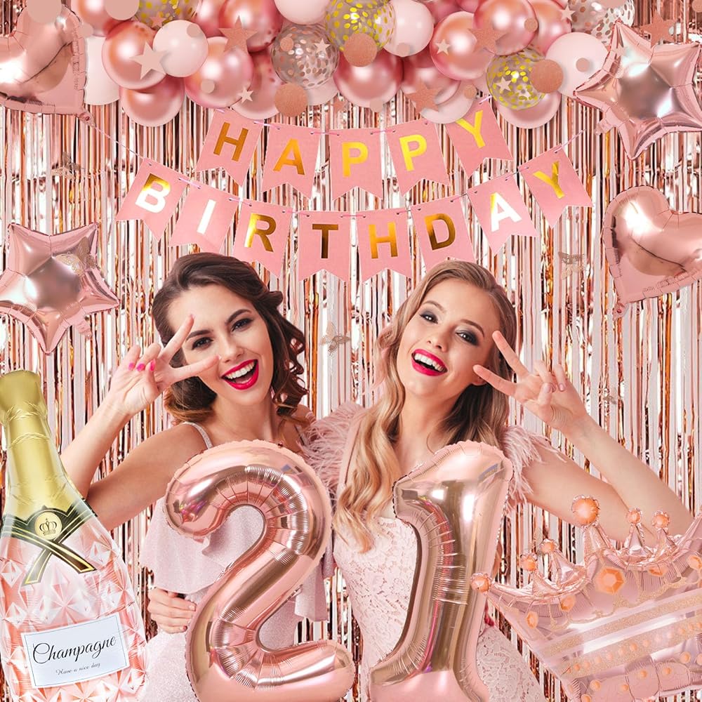 21st Birthday Decorations for Her, Rose Gold Birthday Party Decoration for Women Girls Pink Happy Birthday Banner Fringe Curtain Butterfly Rose Gold Foil Balloons 21st Birthday Gifts Party Supplies