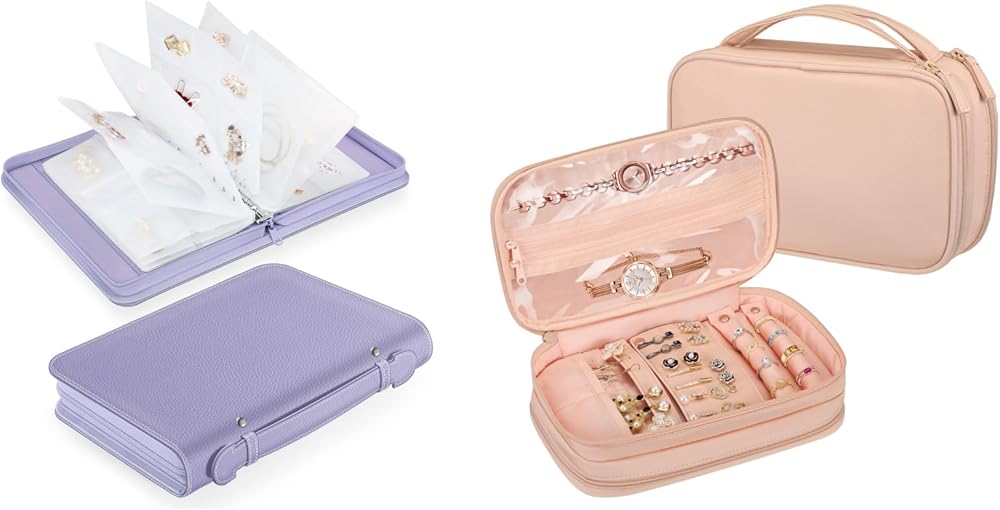 Bundle: Jewelry Travel Organizer Case PU Leather Jewelry Storage Book + Double Layer Jewelry Travel Organizer Case for Necklaces, Earrings, Bracelets(Lilac Purple+Rose Gold)