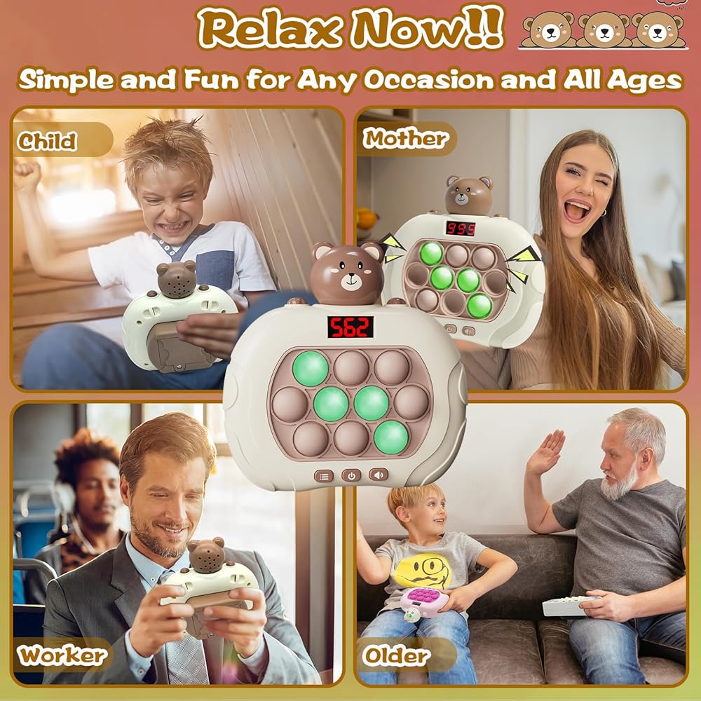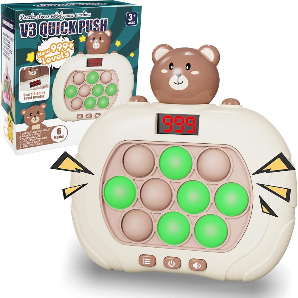 【UPGRADED POP GAME LIGHT UP FIDGET TOY】2024 newly upgraded latest push pop game machine can break through levels by pushing quickly. With an LED Screen, Score Display, Level DIsplay & 999+ levels making it easier to play! Kids will engage in positive thinking, hand-eye coordination, and brain training during play challenges filled with lights and sounds, promoting your child's sensory development and accompanying their intellectual growth.