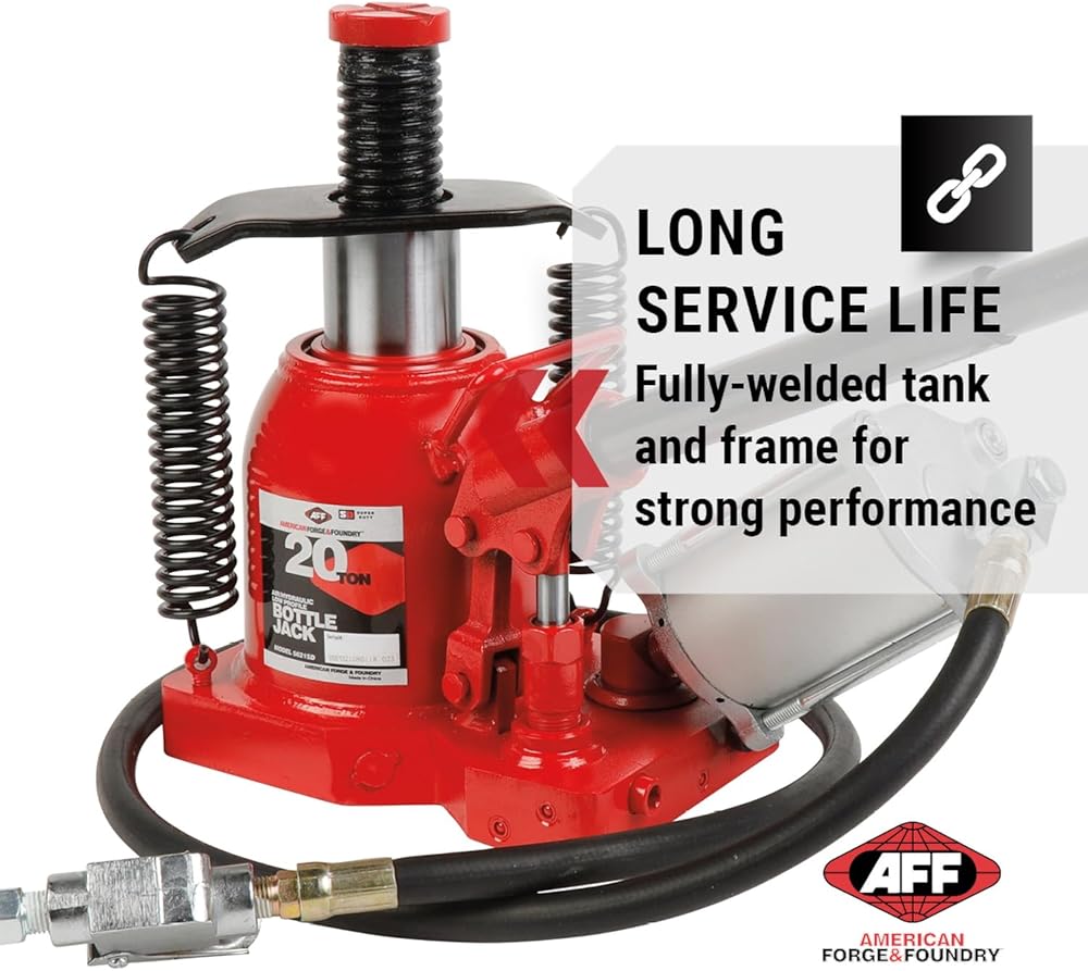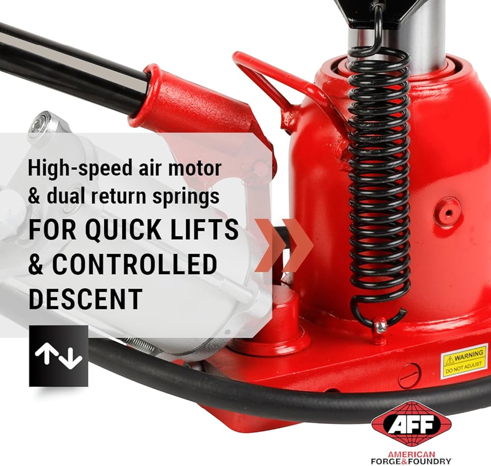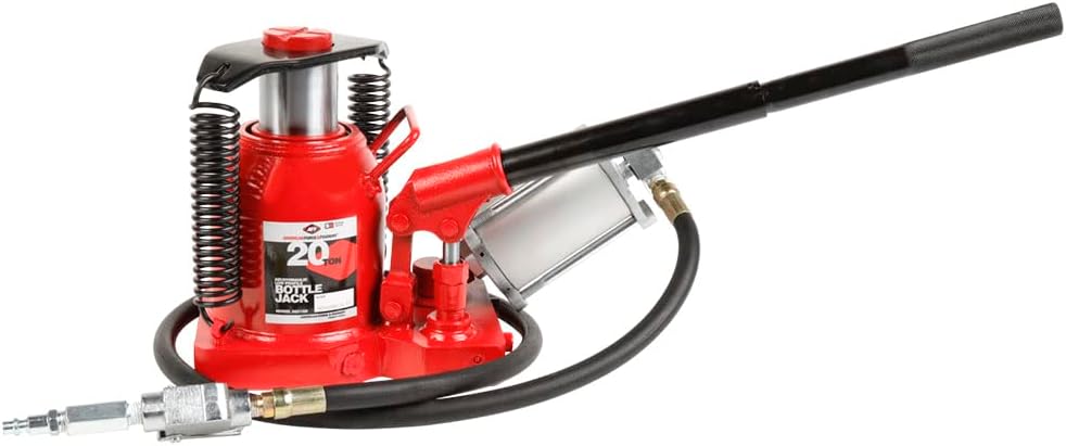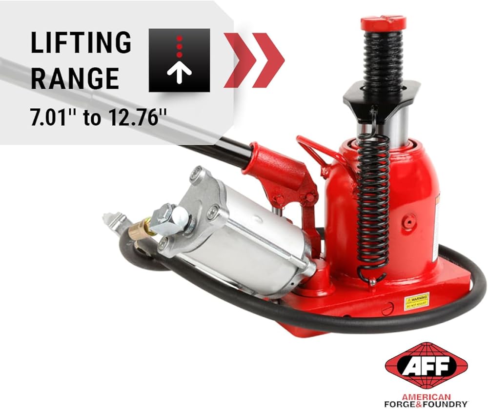 Design: The welded tank and frame provides superior strength; Likewise, the thick base design gives the most stable lifting platform for stronger performance, even in rough surface conditions. Motor: Specially engineered air motor for consistent and reliable operation where dual return springs help provide controlled and easy descent. Height: With a high height of 12.76" and a low height of 7.01", the super durable, 20 ton, bottle jack has shielded release screws that prevent accidental lowering and eventual injury to the user. Capacity: Operates at 110-120 PSI and are factory pretested to 150% of its rated capacity to ensure long shop life and consistent operation.