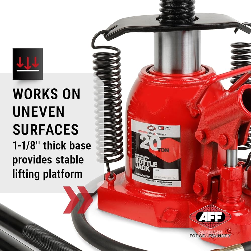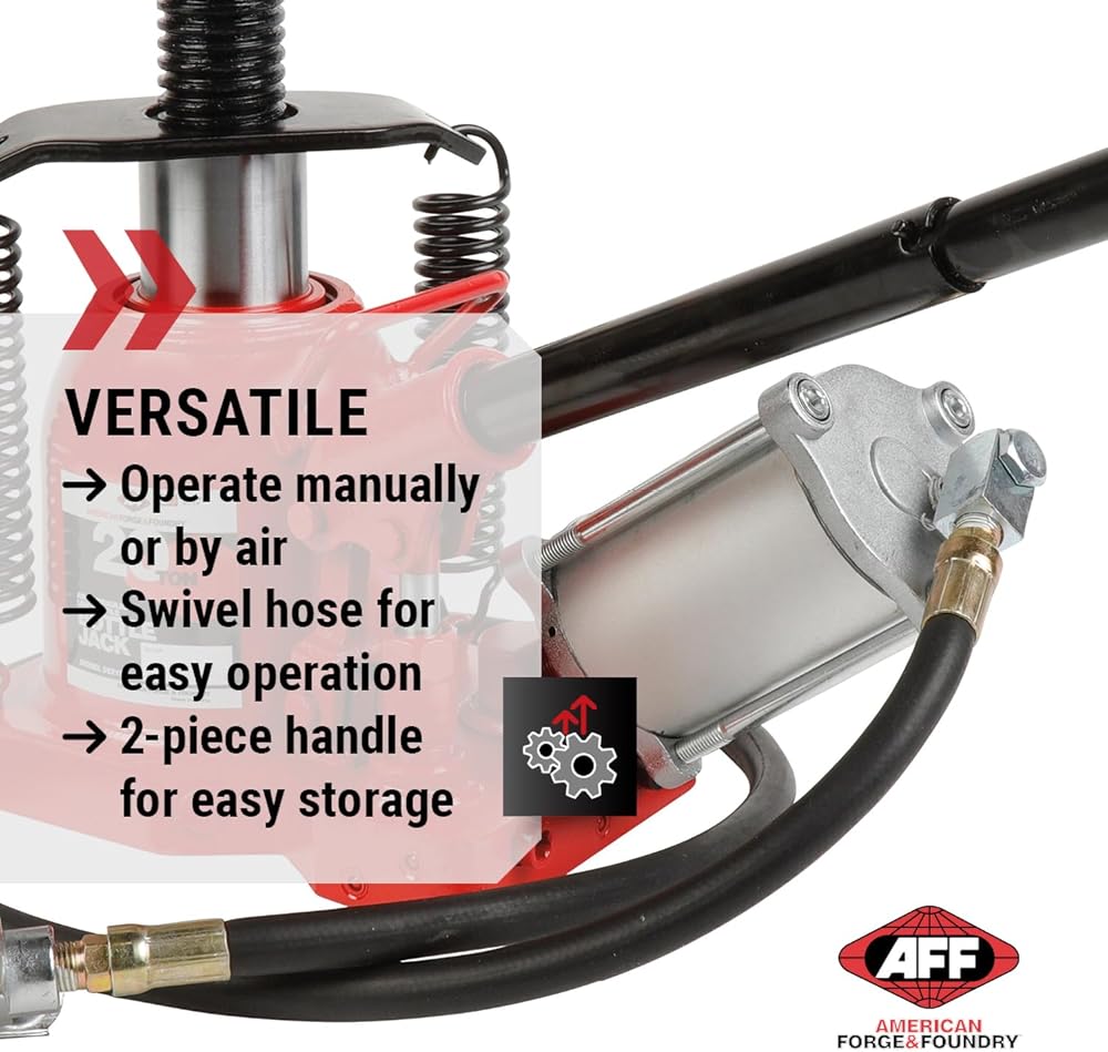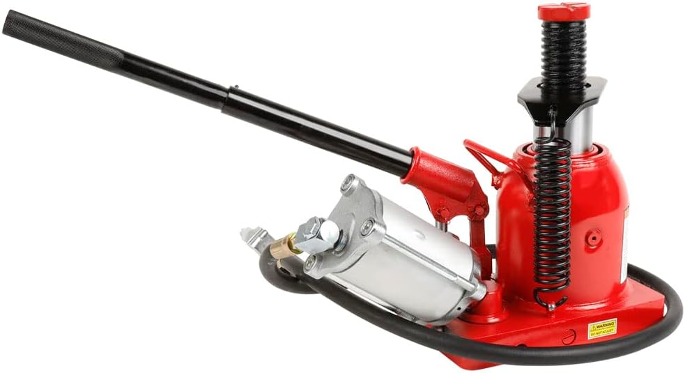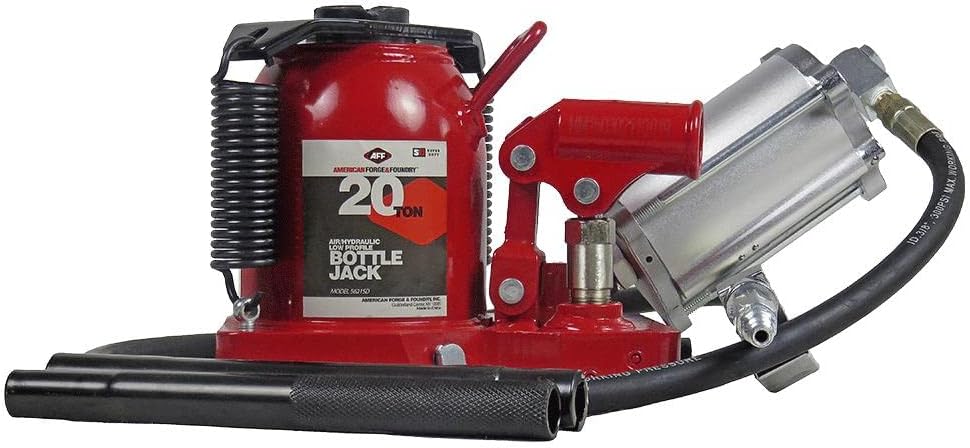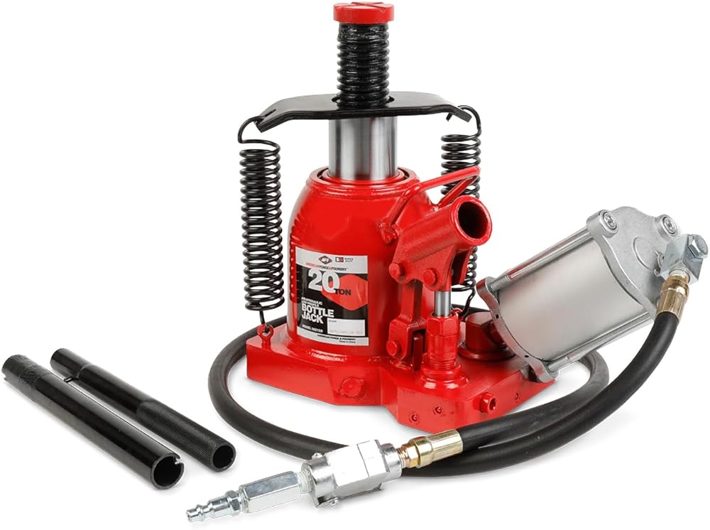 Design: The welded tank and frame provides superior strength; Likewise, the thick base design gives the most stable lifting platform for stronger performance, even in rough surface conditions. Motor: Specially engineered air motor for consistent and reliable operation where dual return springs help provide controlled and easy descent. Height: With a high height of 12.76" and a low height of 7.01", the super durable, 20 ton, bottle jack has shielded release screws that prevent accidental lowering and eventual injury to the user. Capacity: Operates at 110-120 PSI and are factory pretested to 150% of its rated capacity to ensure long shop life and consistent operation.