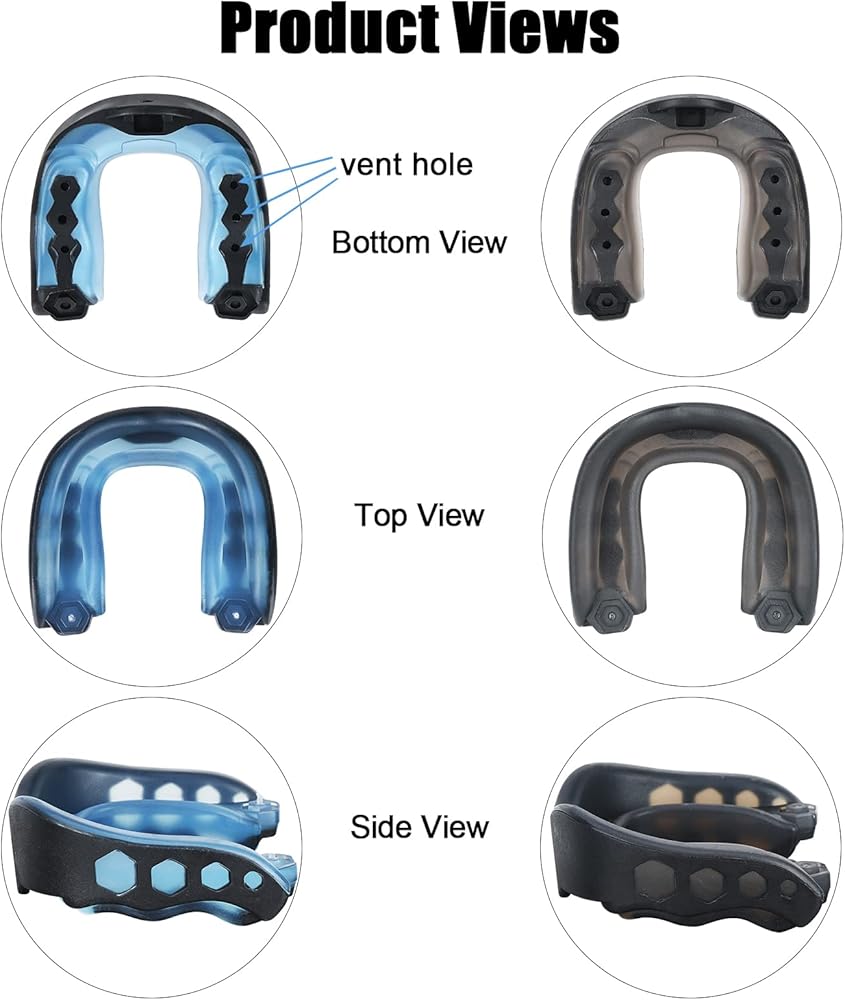 Vent Hole DesignThe mouth guard design with three strategically ventilation hole at the bottom, which allow air to escape more freely to provide an easier breathing experience.
