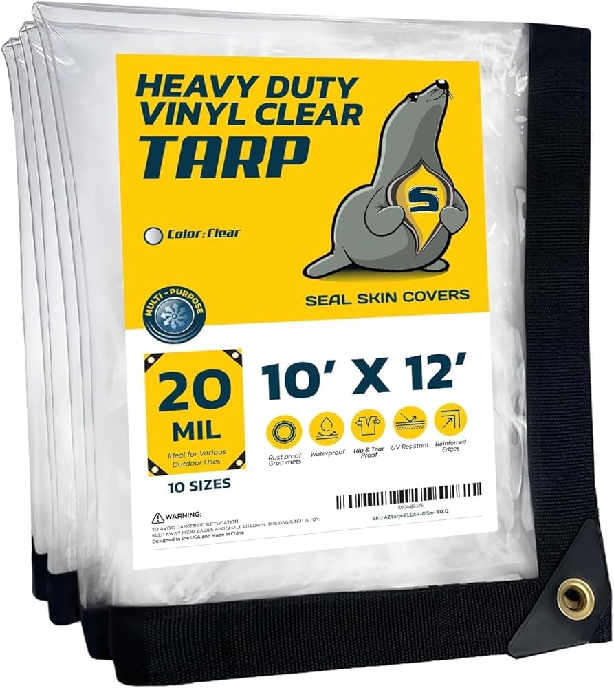 Seal Skin Covers Waterproof Clear Tarp 10x12 FT, 20 Mil 18 OZ 560 GSM Heavy Duty Transparent Vinyl Tarpaulin with Grommets