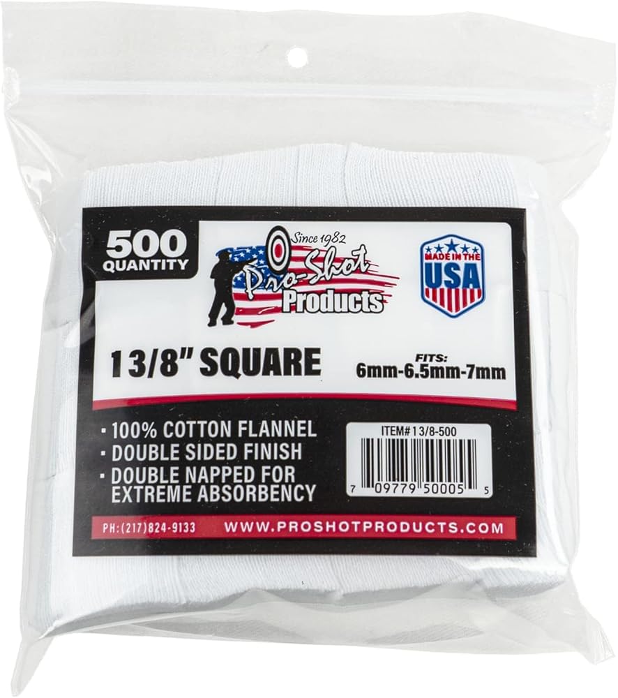 Pro-shot 1 3/8 inch sq patch 500 CT. 6-7Mm. We are the last family owned, traditional full line of firearms cleaning accessories left that is made in America! today we continue our family owned company, with Diana and son John and still Honor My father with his passing in 2005 by producing limited edition products that he always loved and enjoyed himself. In 2012, our 3rd generation is now working at pro-shot to continue our heritage and mission.