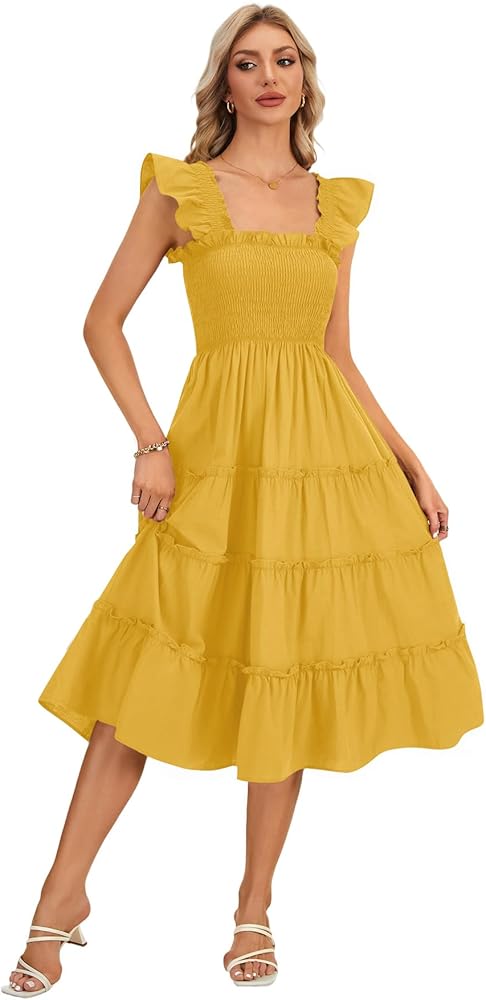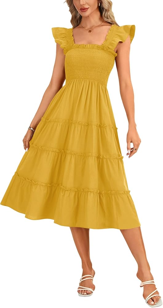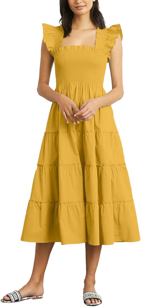 Features: Square neck midi dress with a wide ruffle strap, flexible smocked waist, show your waistline but not too tight, a line and tiered hem, special and look like a countryside vintage sundress, is perfectly for a cute and trendy outfit.