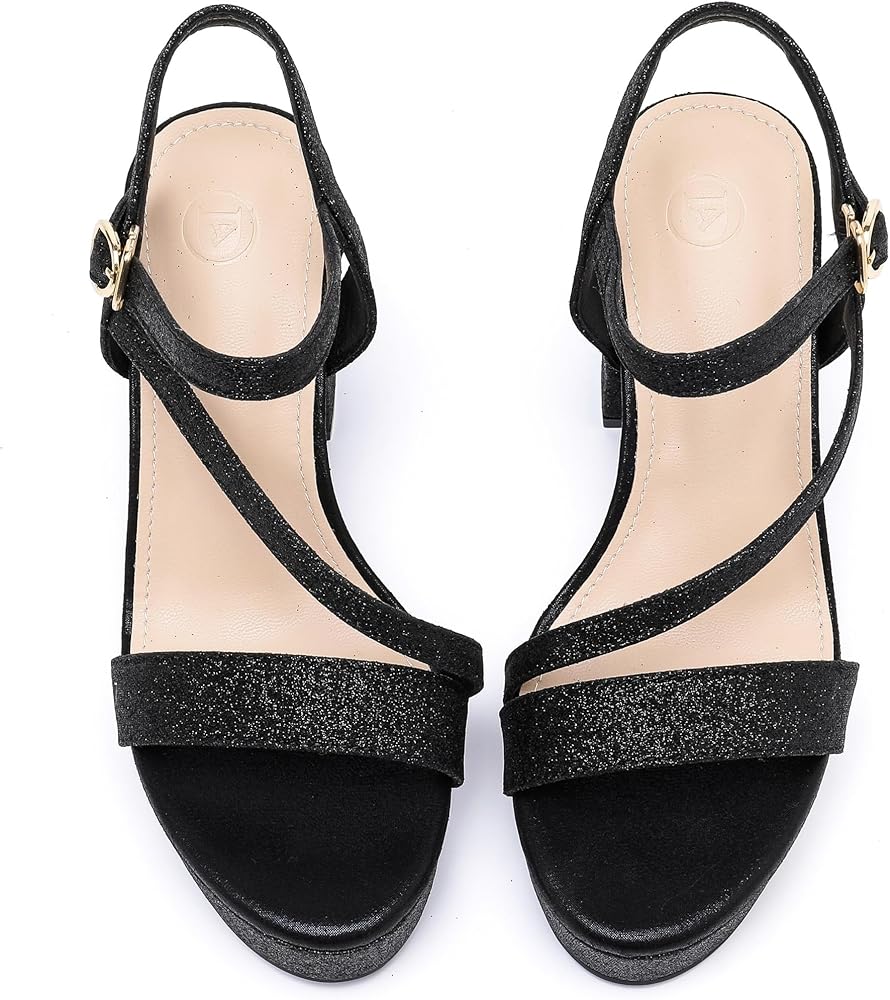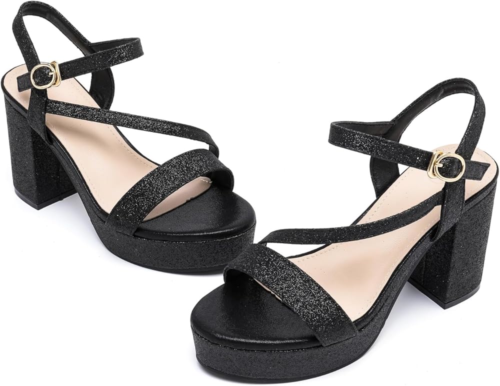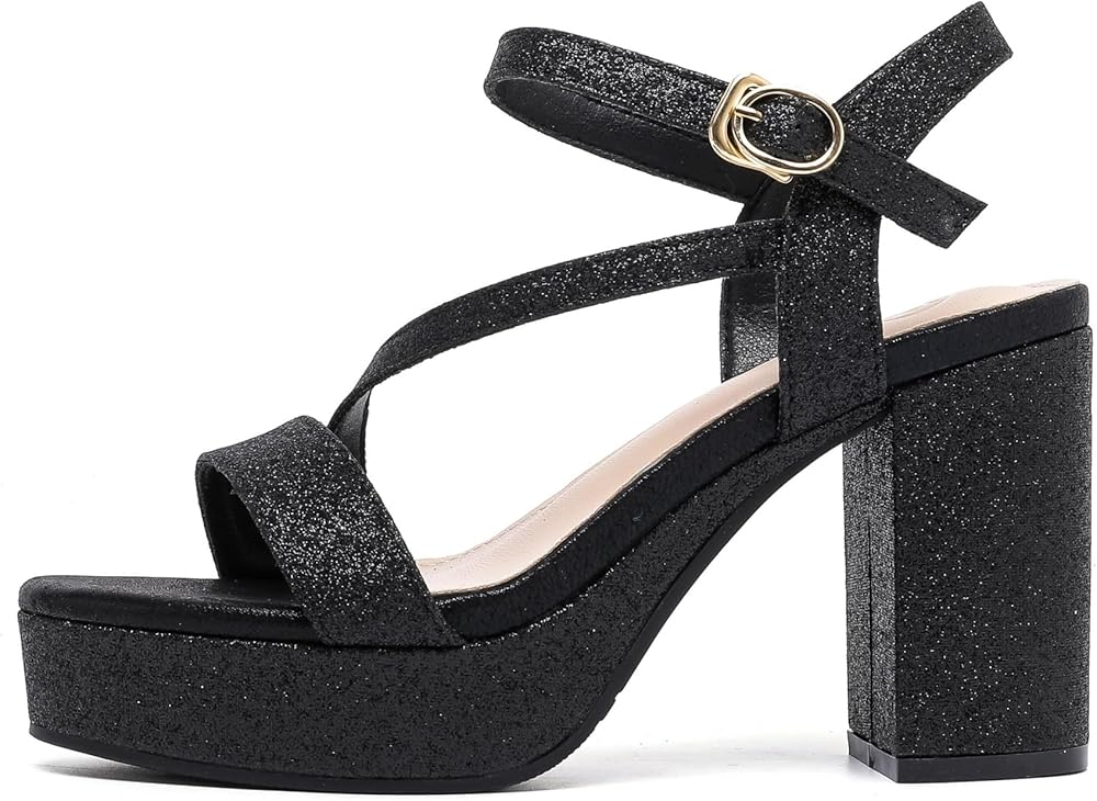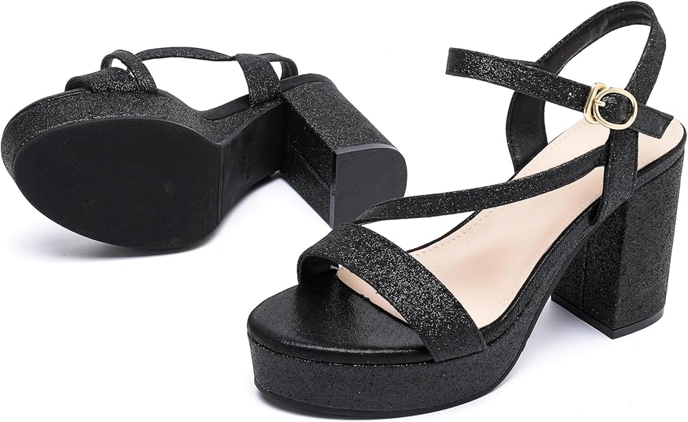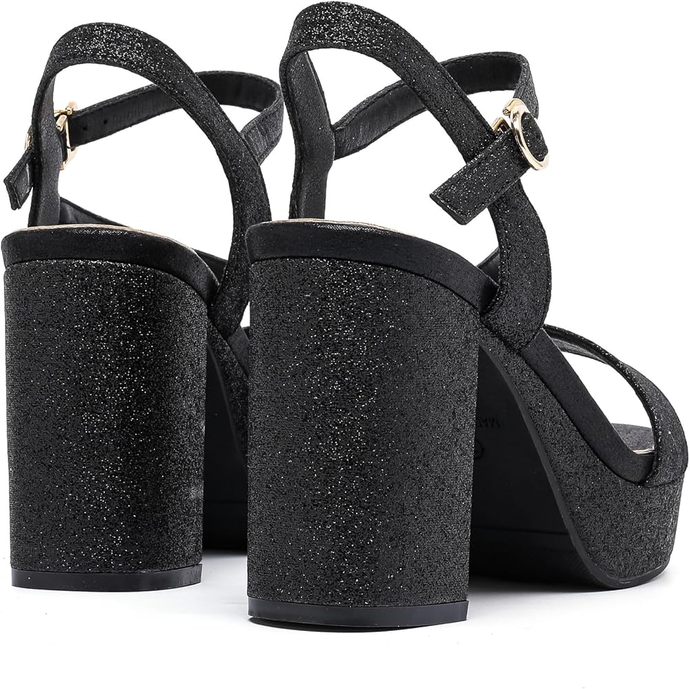 【Accentuate your legs】Ultra-chic style women block chunky platform high heels,with glitter black, glitter gold, glitter silver color,these stylish heels heel sandals create the illusion of longer legs and can extend your figure,make you always stand out from the crowd.